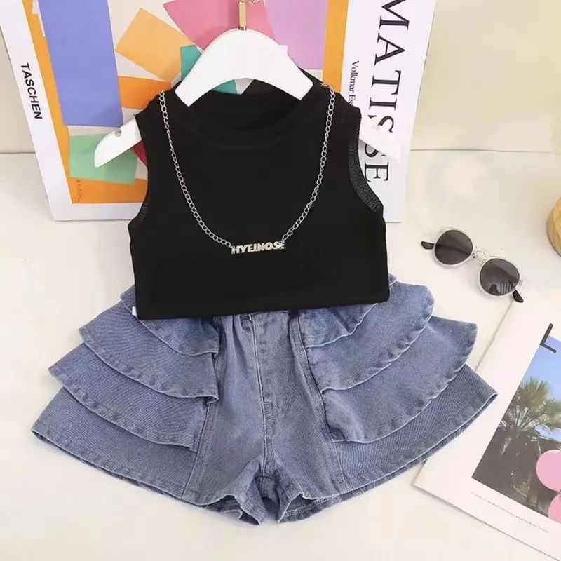 • 블랙 코튼 조끼 + 얇은 데님 반바지 스커트