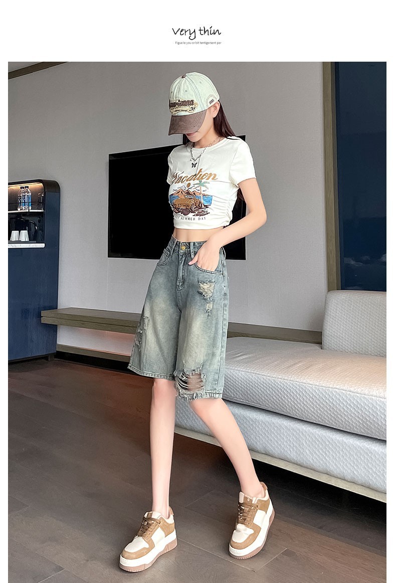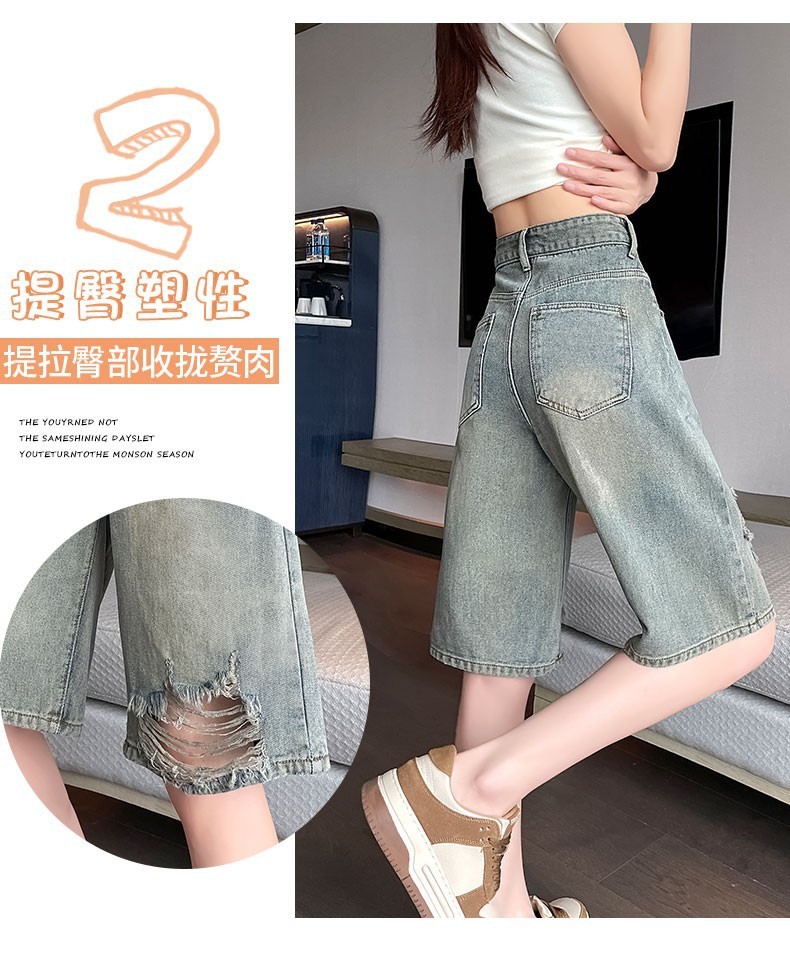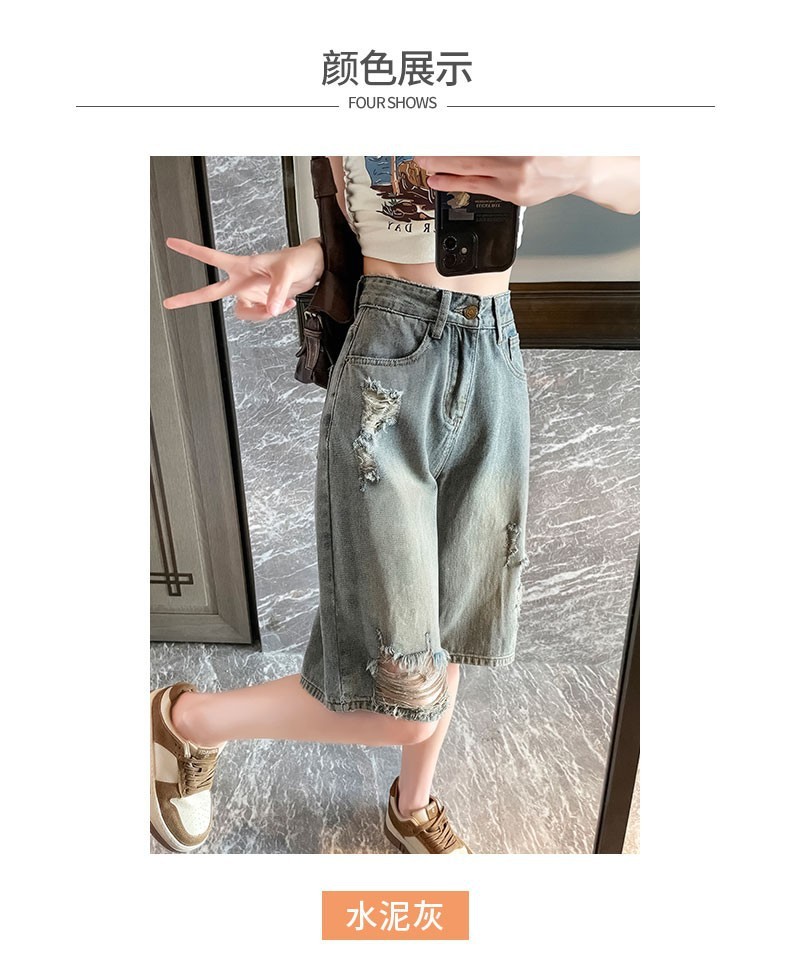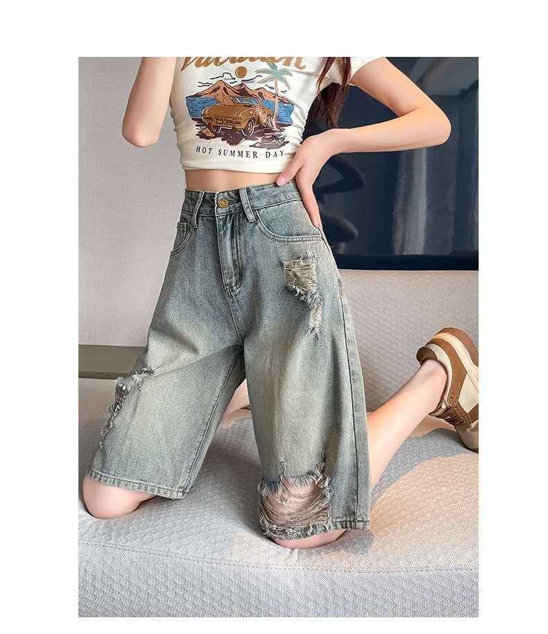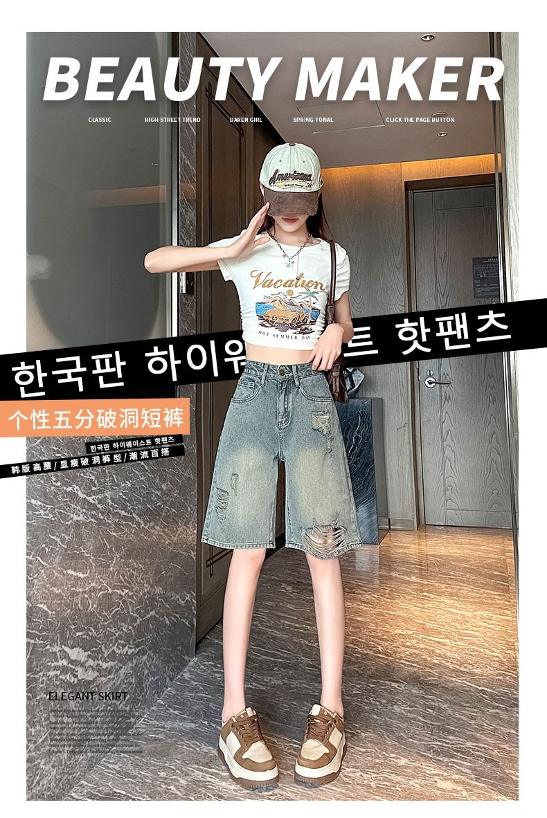 시멘트 애쉬, 5 점 청바지 찢기 여자 2025 년 여름 얇은 느슨한 배 모양의 중간 길이 바지 향수 5 점 반바지스토어 가기