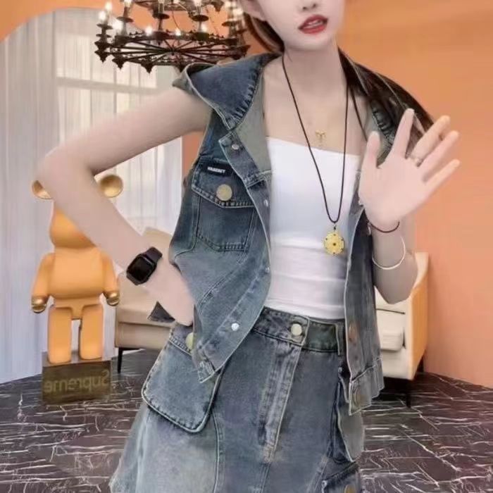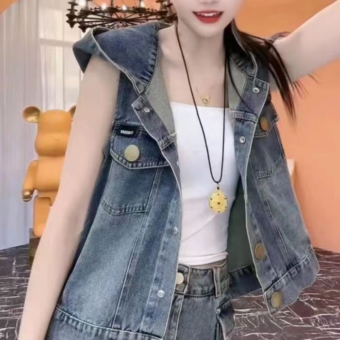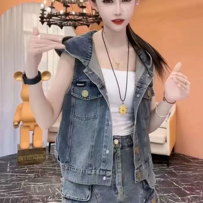 데님 조끼 후드 2025 여성 인기 여름 백리스 스타일 한국 스타일 슬림 패션 트렌디 라이트 풀오버스토어 가기
