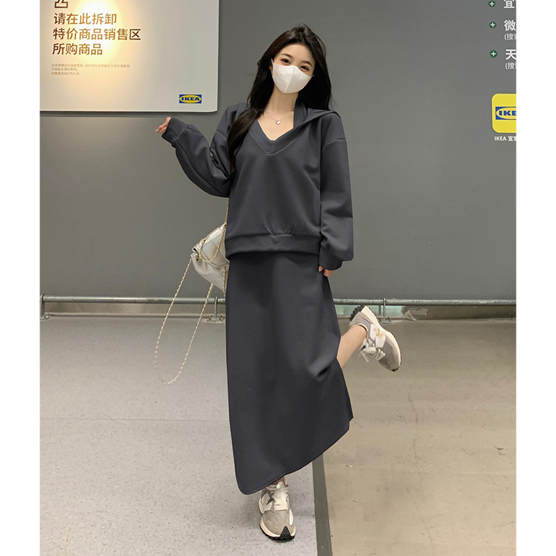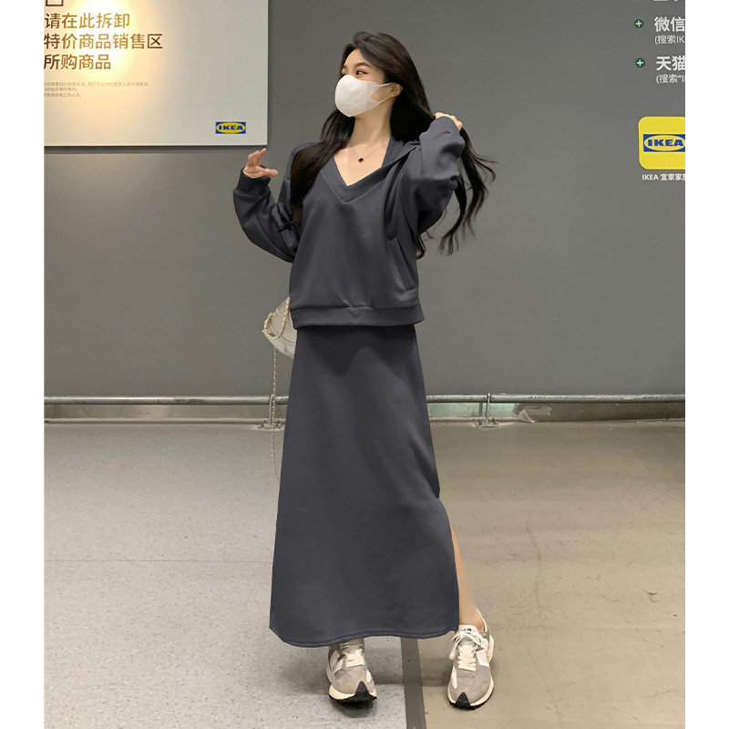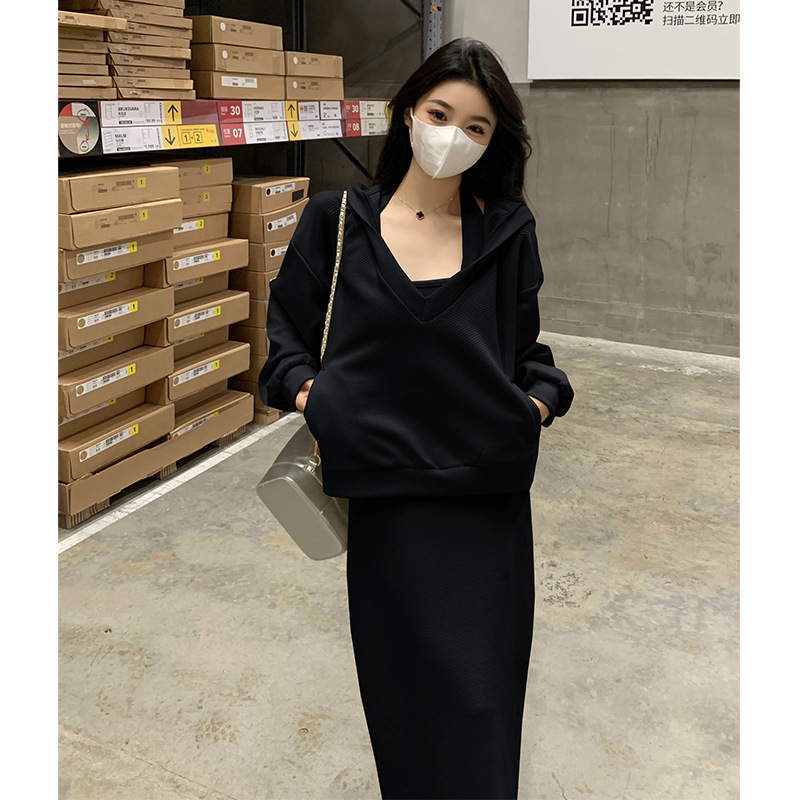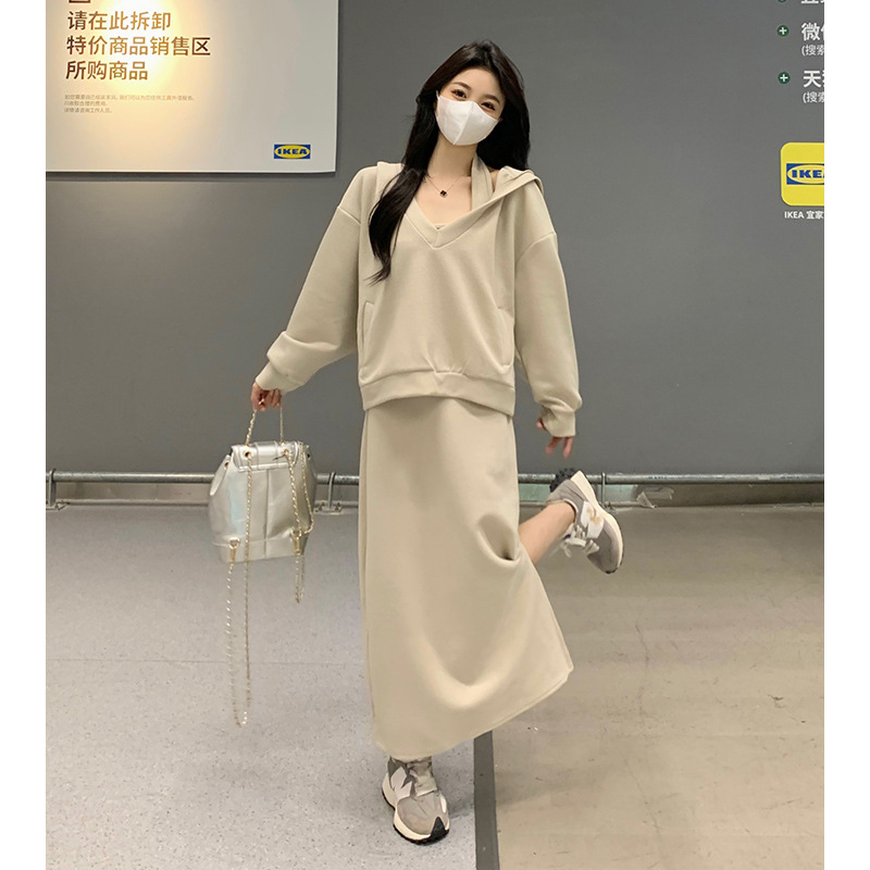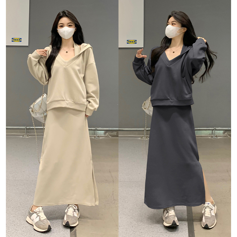 2025 봄 가을 신상 한국 스타일 루즈핏 후드 스웨트셔츠 세트 여성스러운 니트 홀터넥 드레스 투피스 세트 트렌디스토어 가기