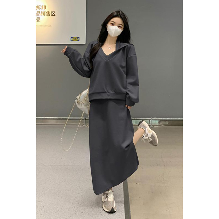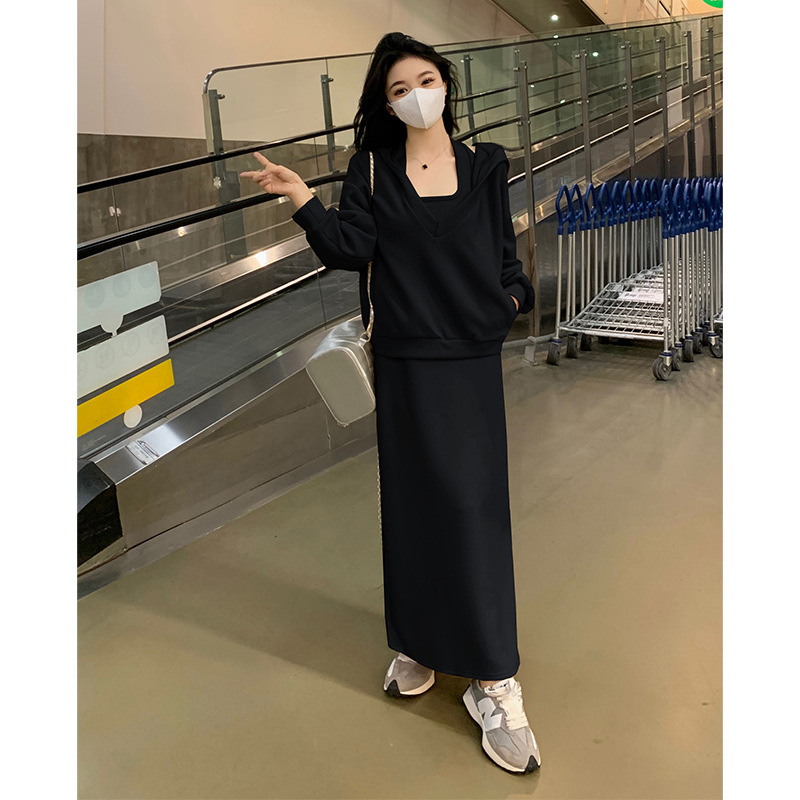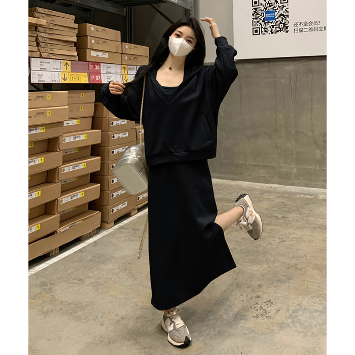 2025 봄 가을 신상 한국 스타일 루즈핏 후드 스웨트셔츠 세트 여성스러운 니트 홀터넥 드레스 투피스 세트 트렌디
