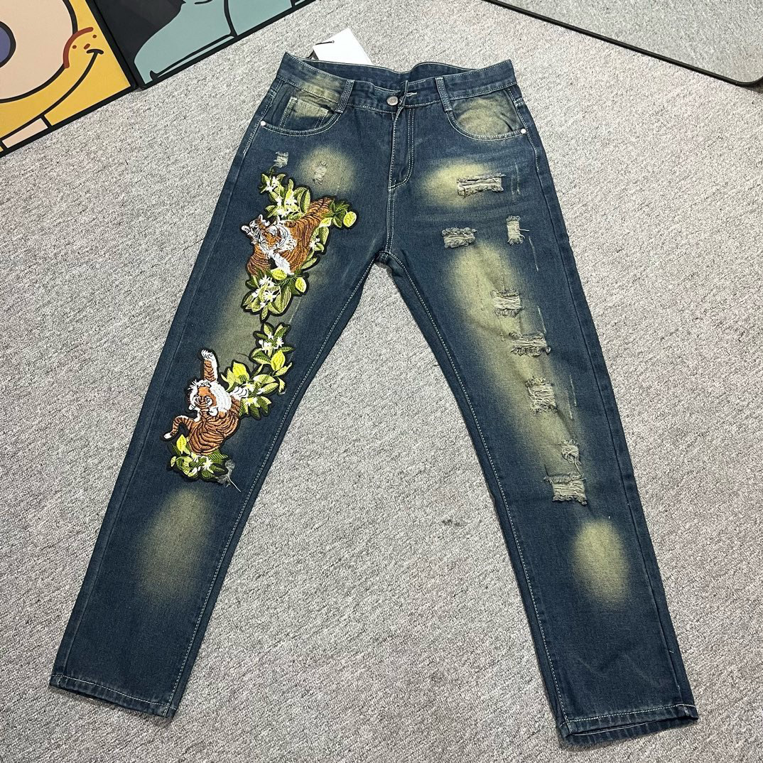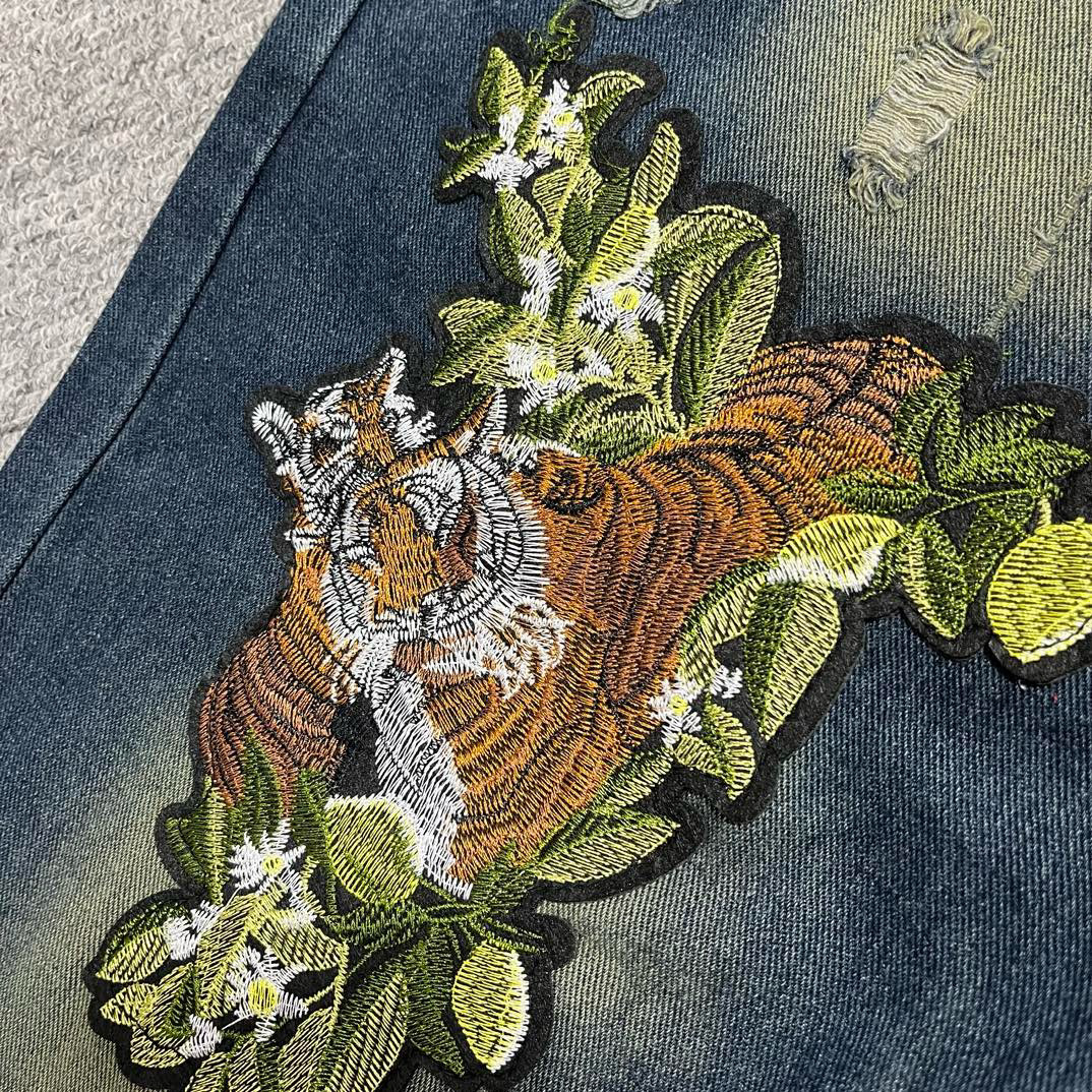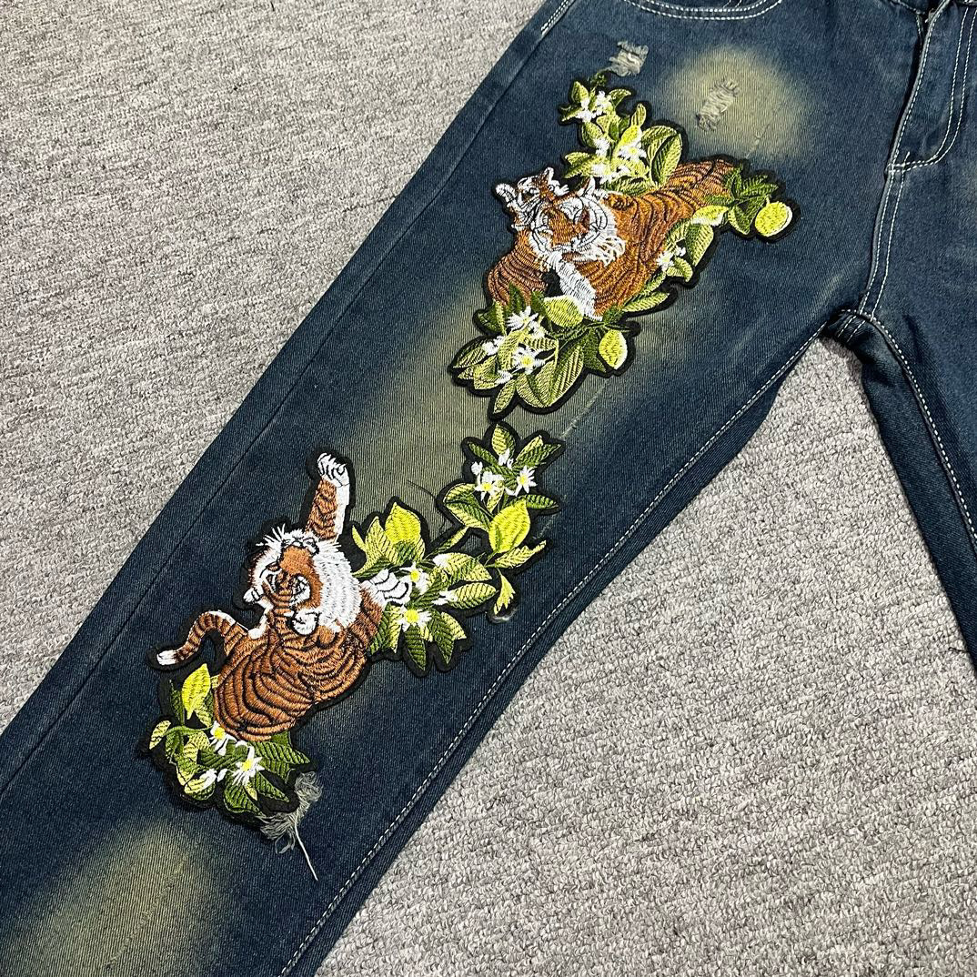 2024 여름 인터넷 붉은 고대 파란 청바지 자수 호랑이 남자의 느슨한 스트레이트 바지 미국 스타일 하이 스트리트 슬림-적합 바지스토어 가기