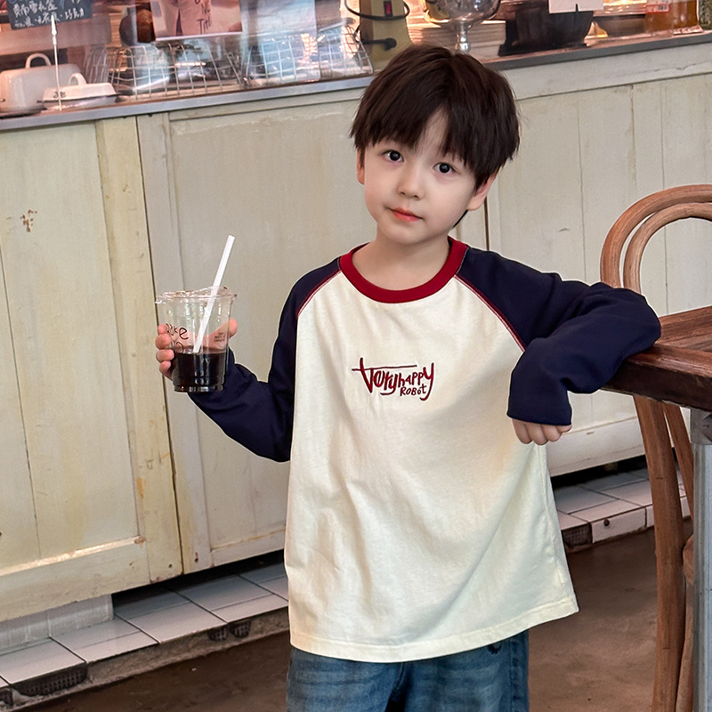 Aimo Beibei 2025 봄, 가을 중소형 어린이 라글란 긴팔 코튼 티셔츠 소년 잘 생긴 컬러 블록 편지 탑스토어 가기