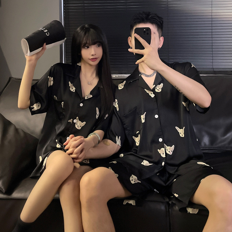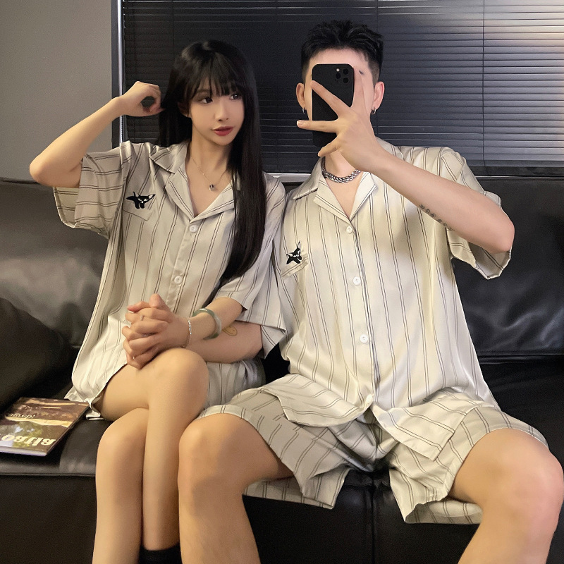 새로운 커플 잠옷 여성 여름 아이스 실크 하이 엔드 반팔 인터넷 인기 스타일 남성 홈 의류 세트 여성 여름