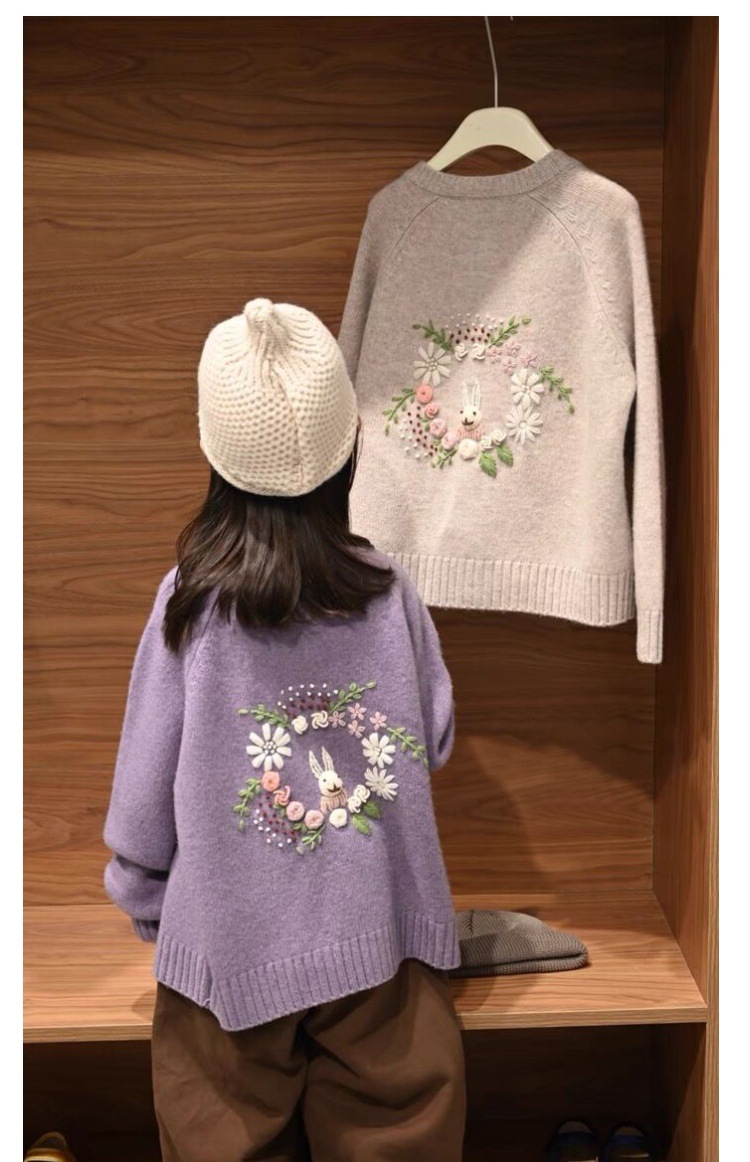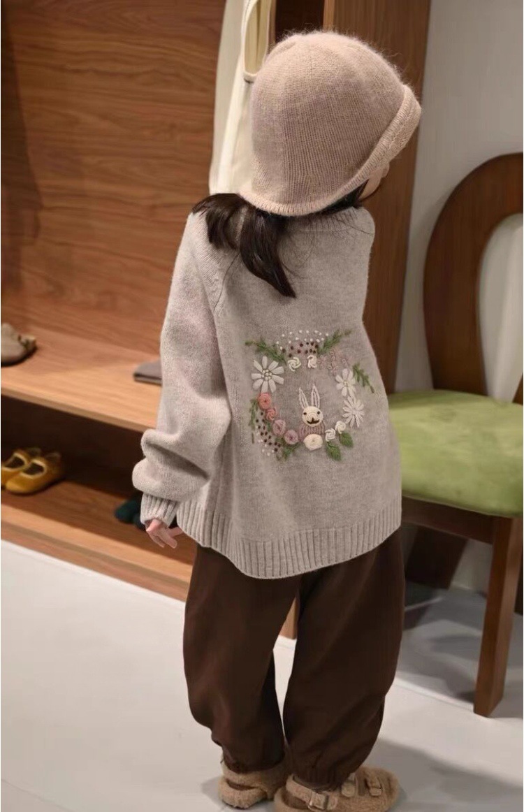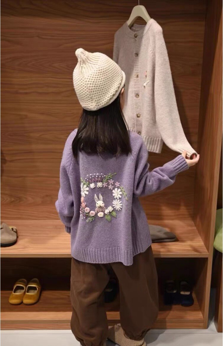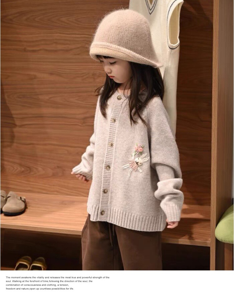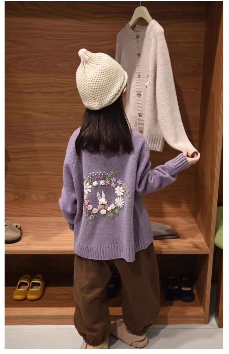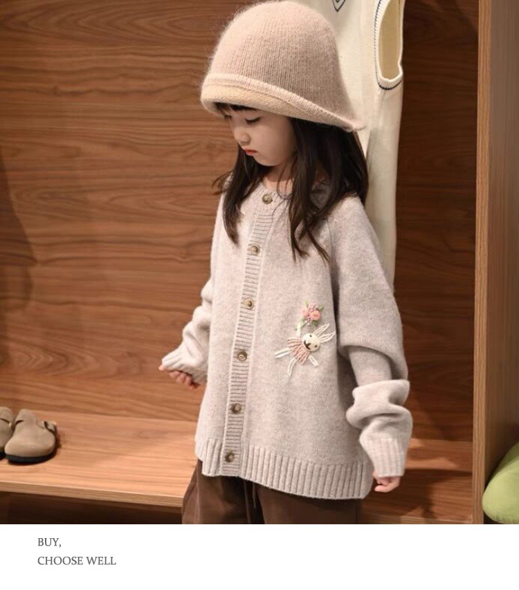 소녀 코트 가을 2024 새로운 어린이 니트 카디건 서양식 만화 토끼 크루 넥 중 큰 어린이 탑스토어 가기