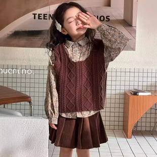 女童春秋套装2024新款儿童针织马甲洋气秋装中大童碎花衬衫两件套