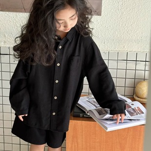 女童衬衫秋装2024新款男女童棉麻长袖春秋款洋气儿童黑色翻领上衣