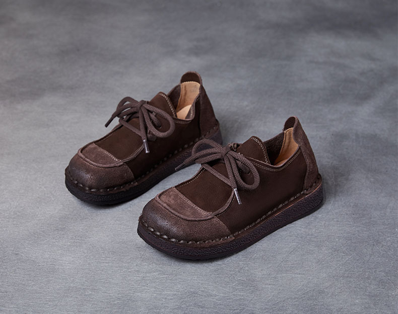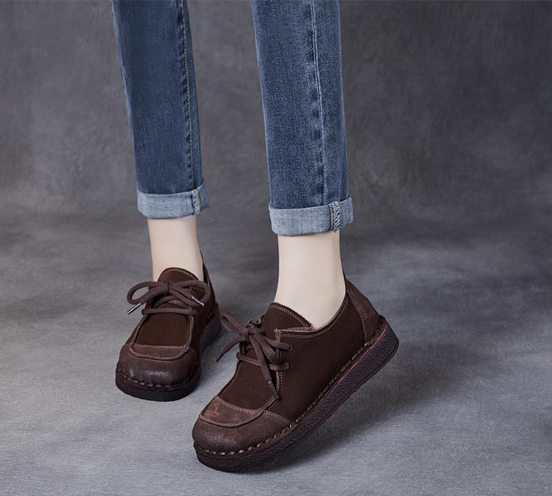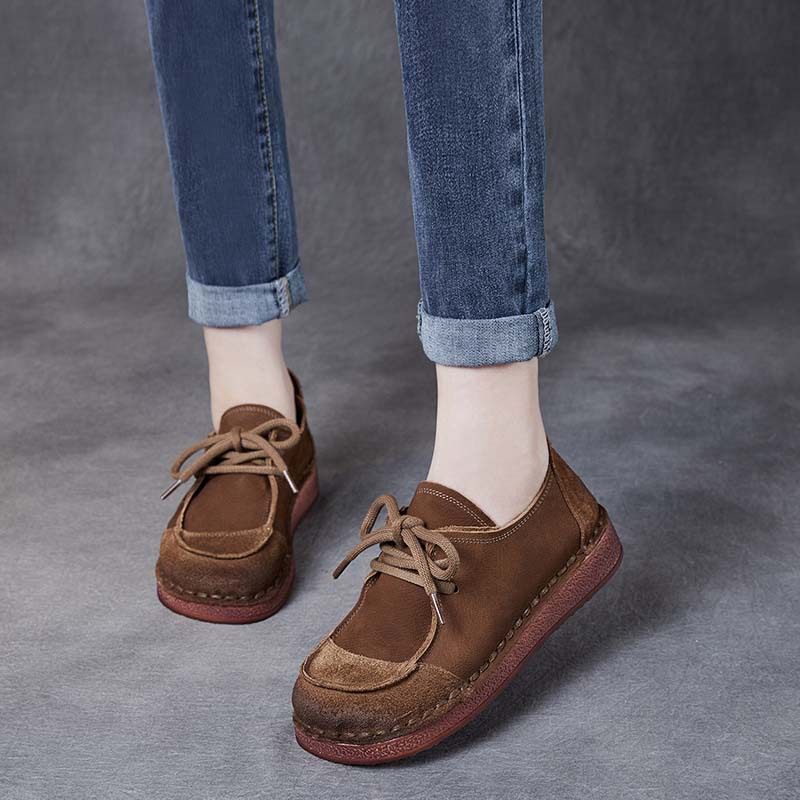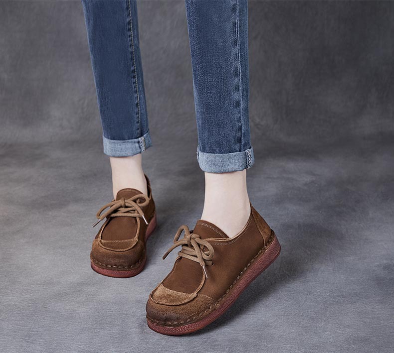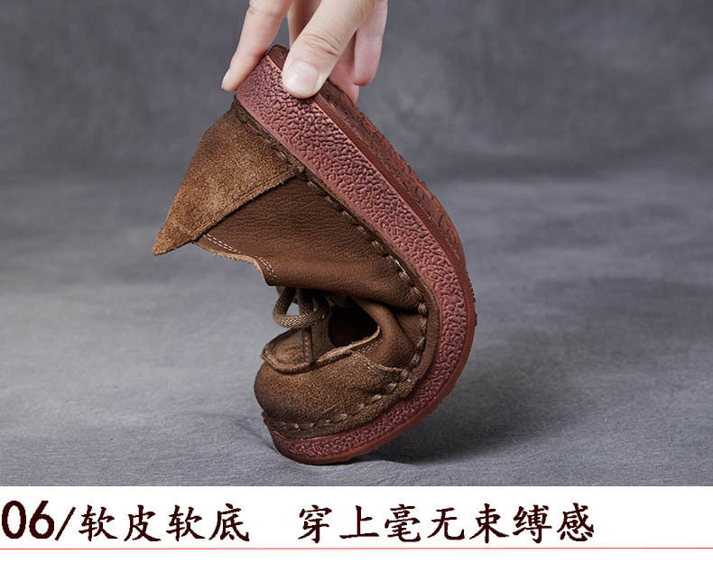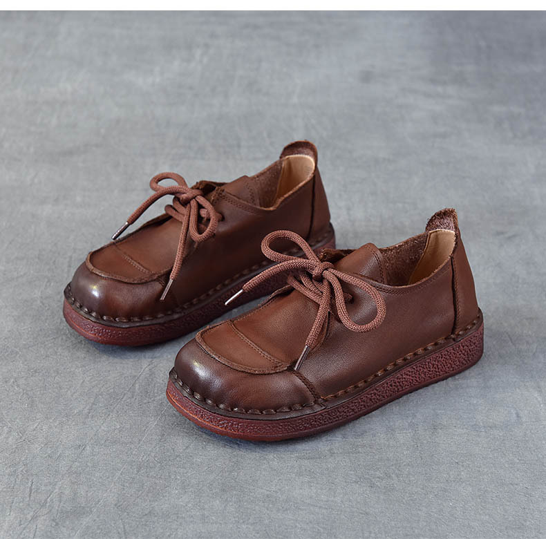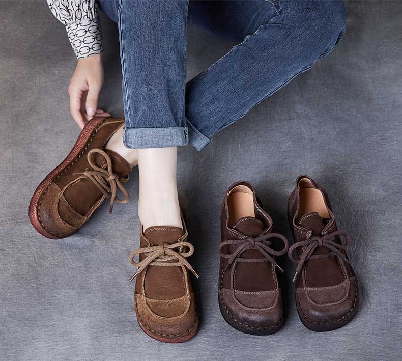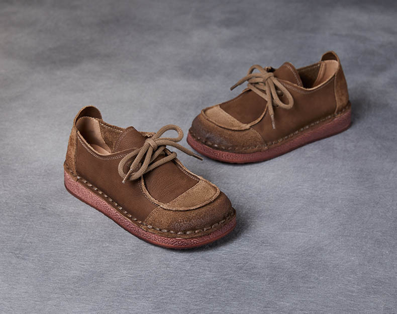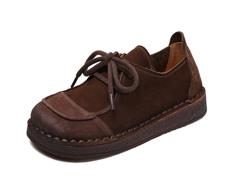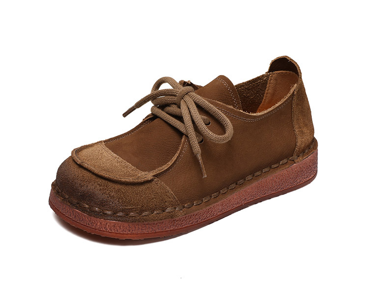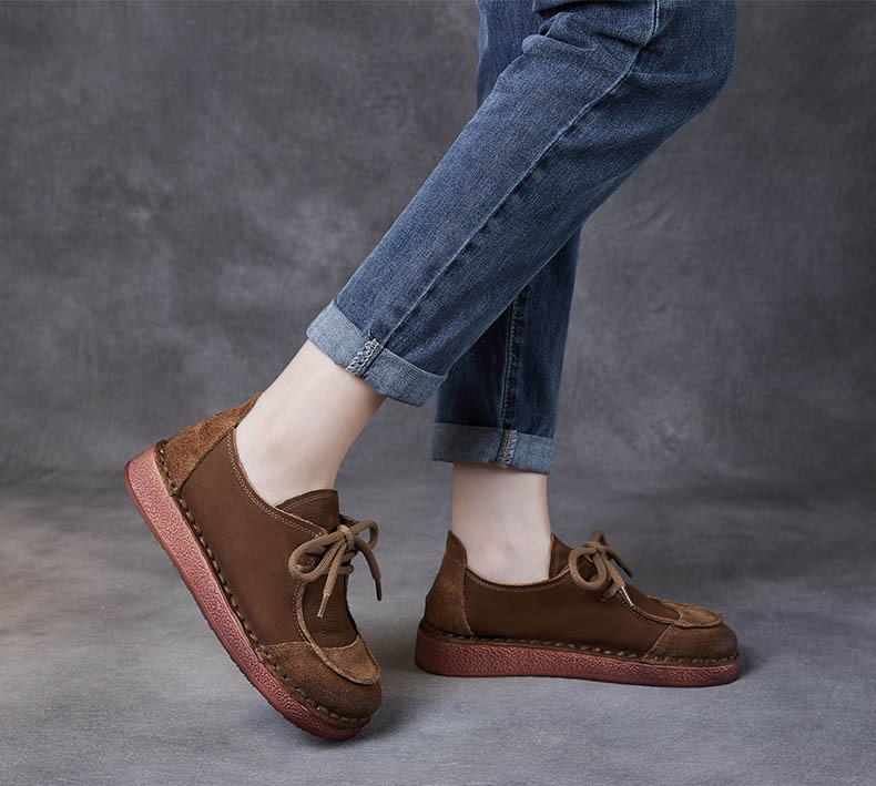 봄과 가을 새로운 패션 컬러 매칭 레트로 부드러운 밑창 여성 싱글 레이어 신발 플랫 콩 가죽 레이스 업 여성 신발스토어 가기