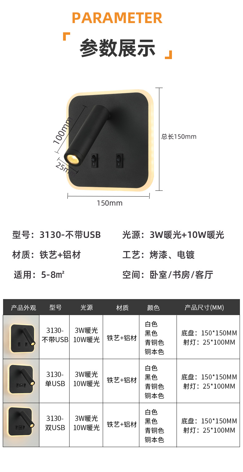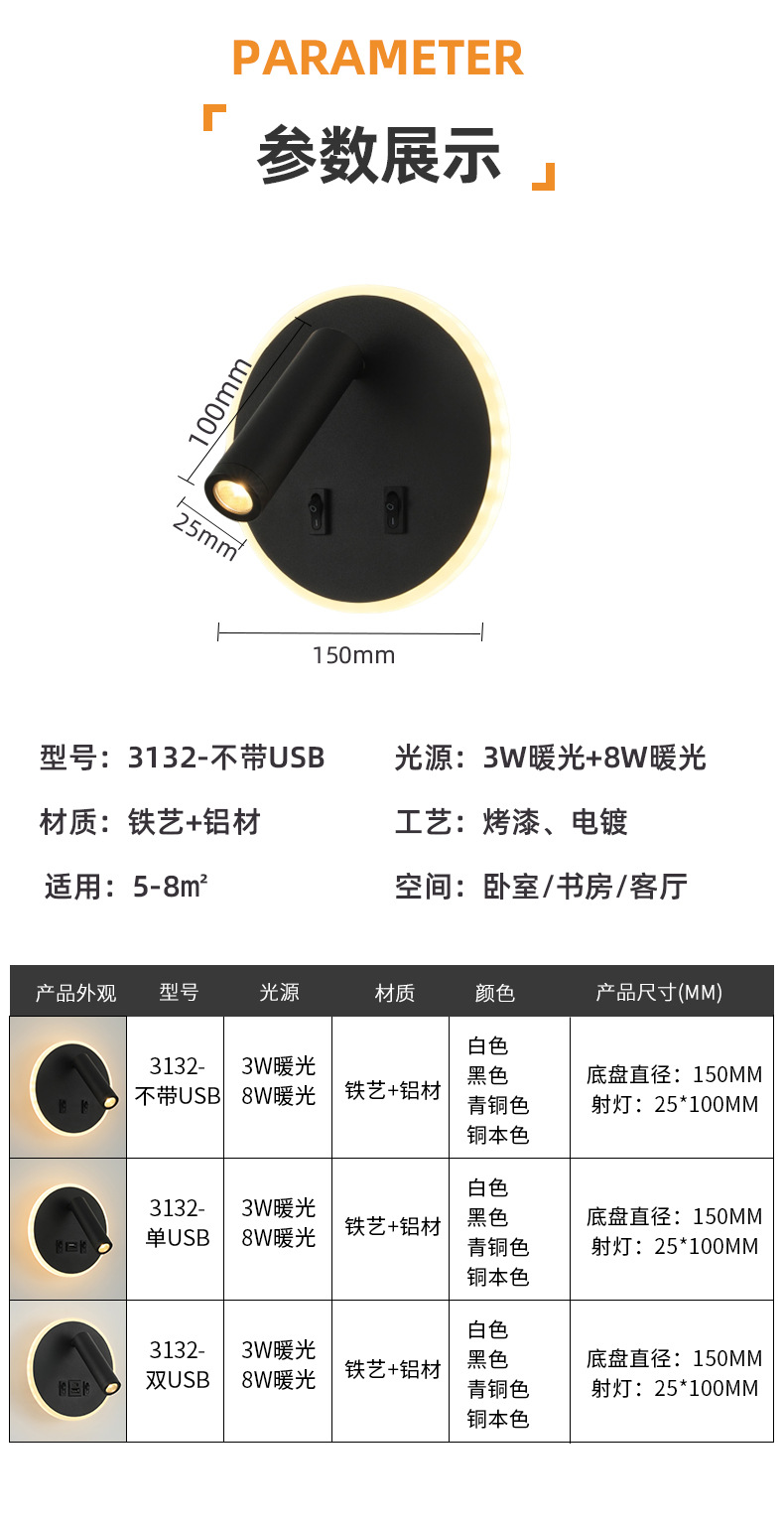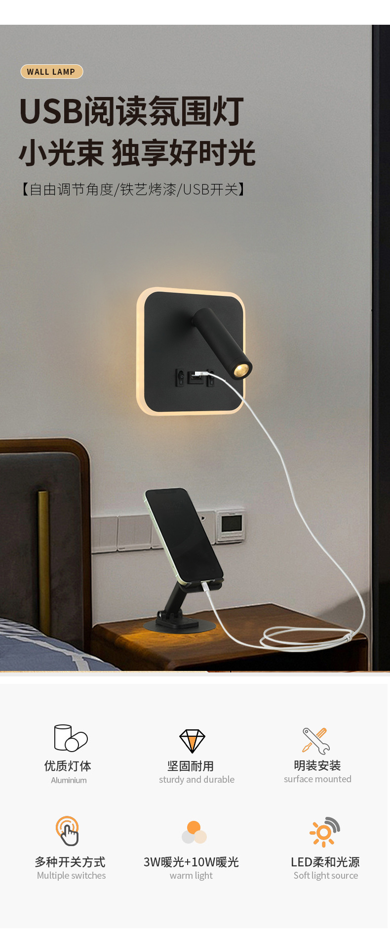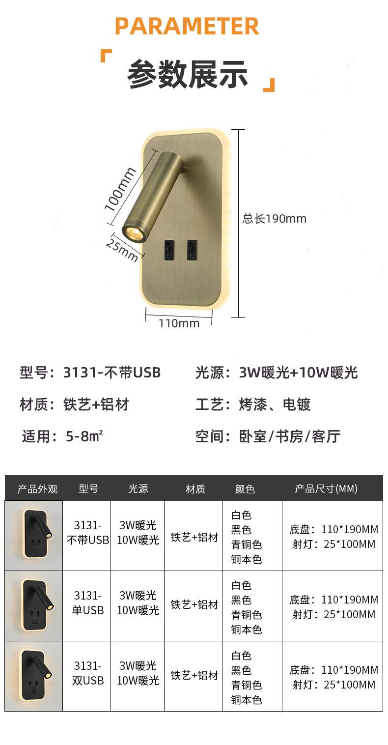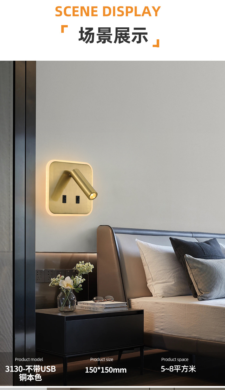 크로스보더 벽 램프 미니멀리스트 호텔 침대 옆 독서 램프 Type-c Type-AUSB 충전식 침실 벽 램프(스위치 포함)스토어 가기