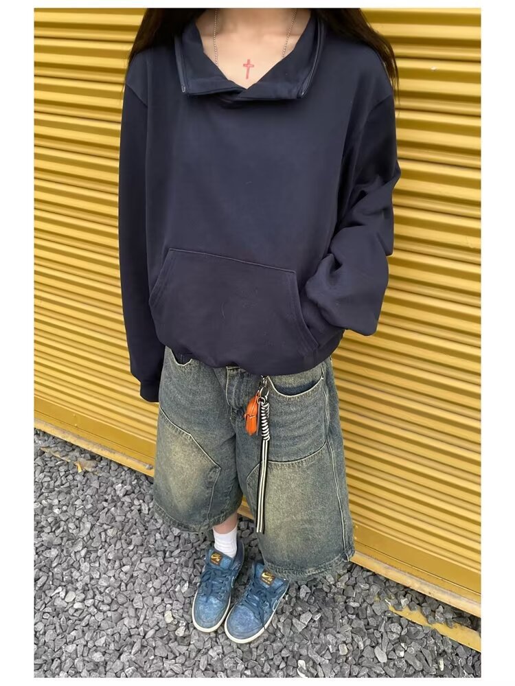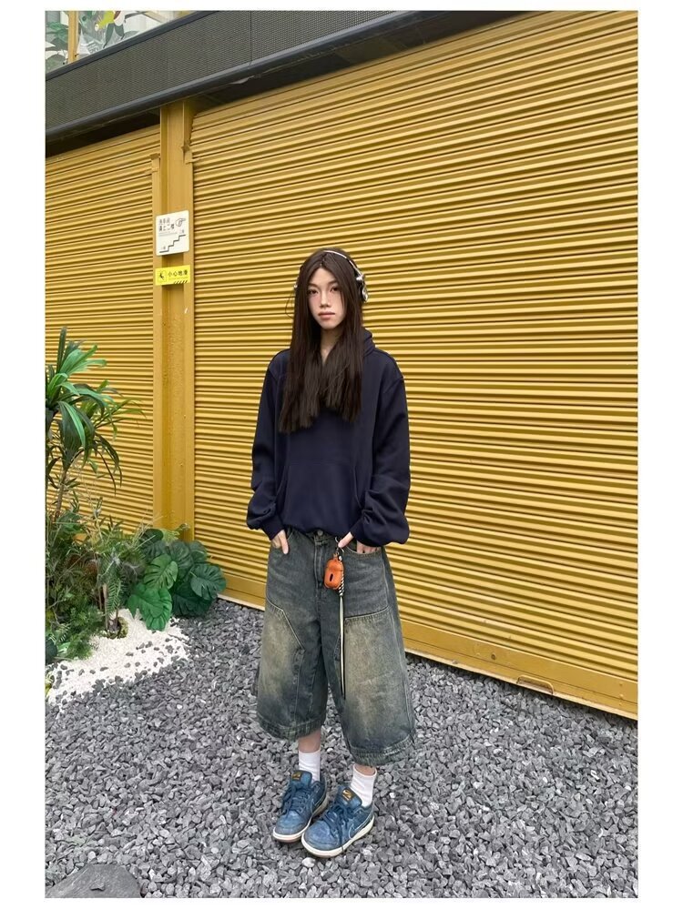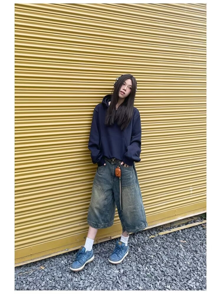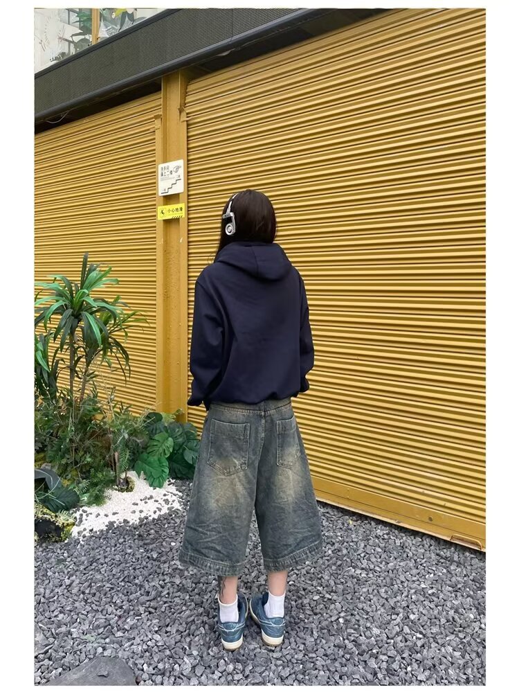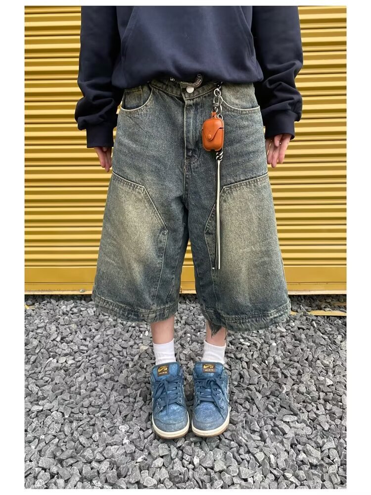 아메리칸 스타일 레트로 세탁 하이 스트리트 데님 반바지 남녀 스트레이트 와이드 레그 올드 루즈 캐주얼 올 매치 크롭 팬츠