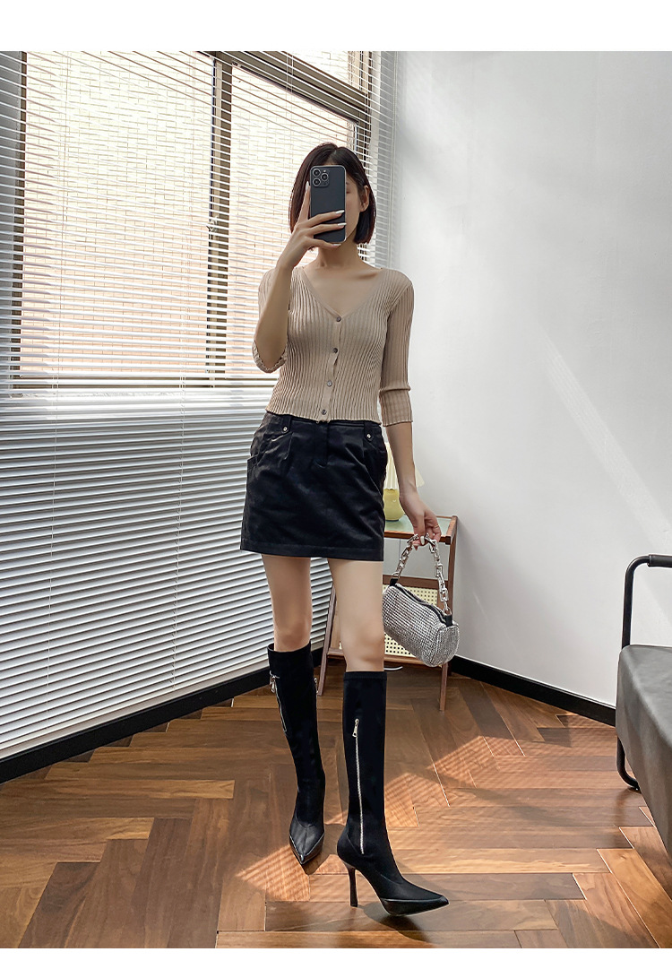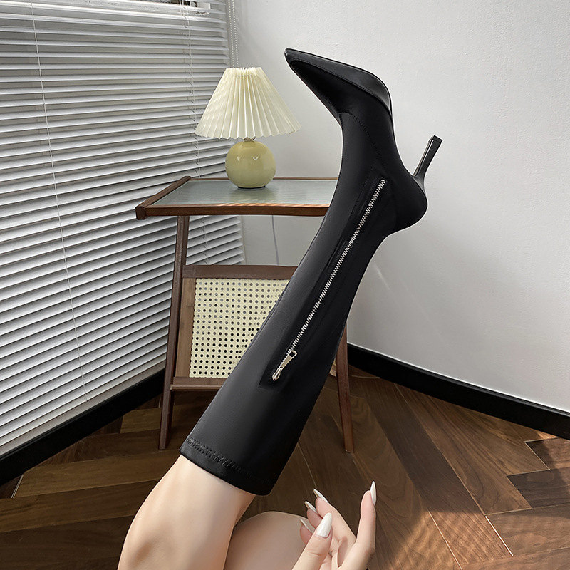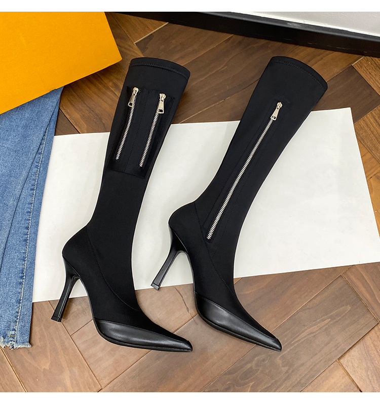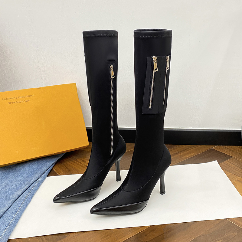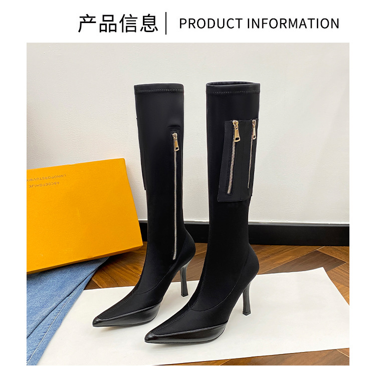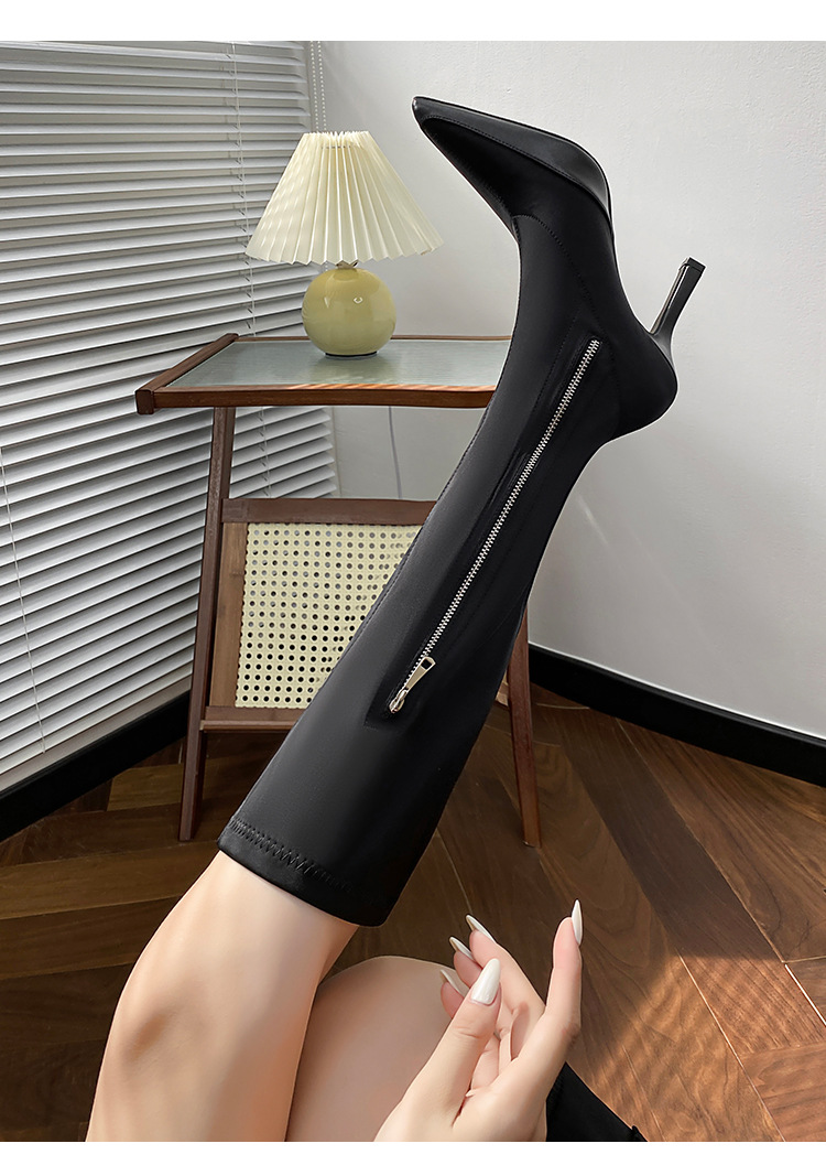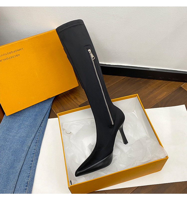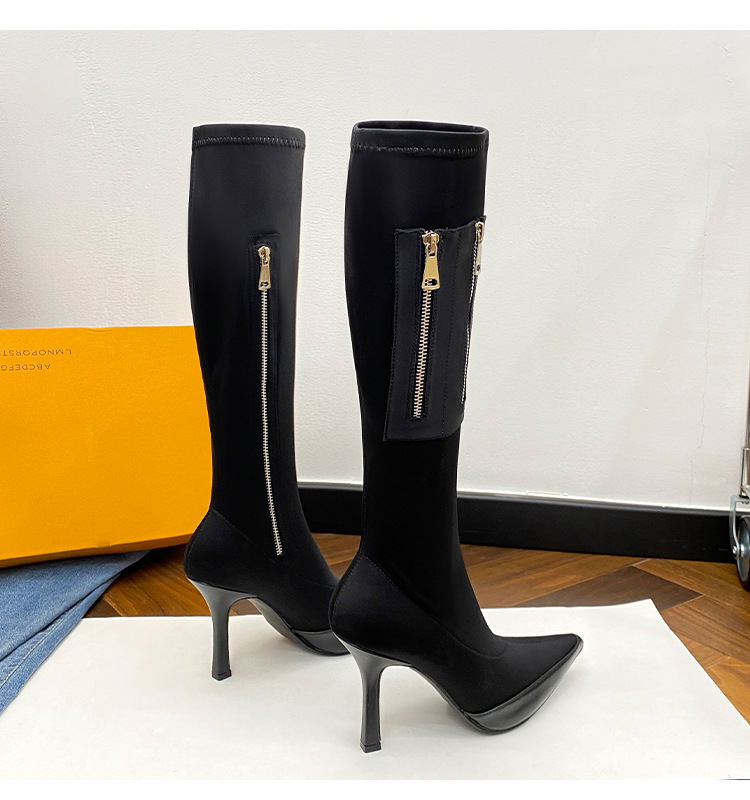 2025년 가을 겨울 신상 여성용 슬림핏 롱부츠, 스틸레토 힐, 뾰족코, 새틴 소재, 유럽풍, 탄력있는 슬림 부츠스토어 가기