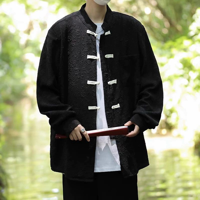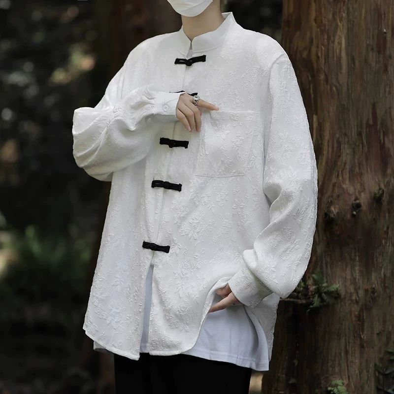 새로운 중국 스타일 칼라 자카드 셔츠 남자 긴팔 국가 스타일 당나라 코트 가을 새로운 유행 느슨한 버클 셔츠