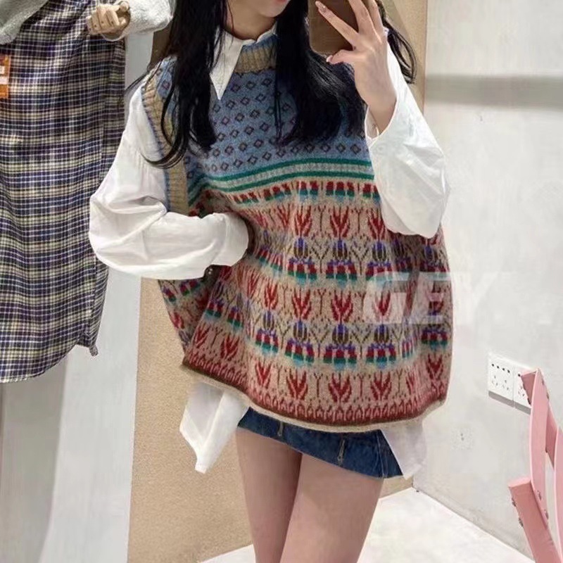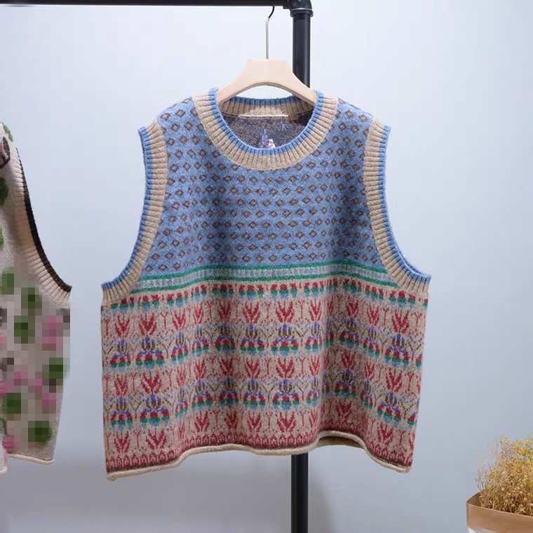 예술적 복고풍 조끼 스웨터 여성 민소매 느슨한 게으른 스타일 둥근 목 작은 꽃 캐주얼 2024 풀오버 스웨터 여성스토어 가기