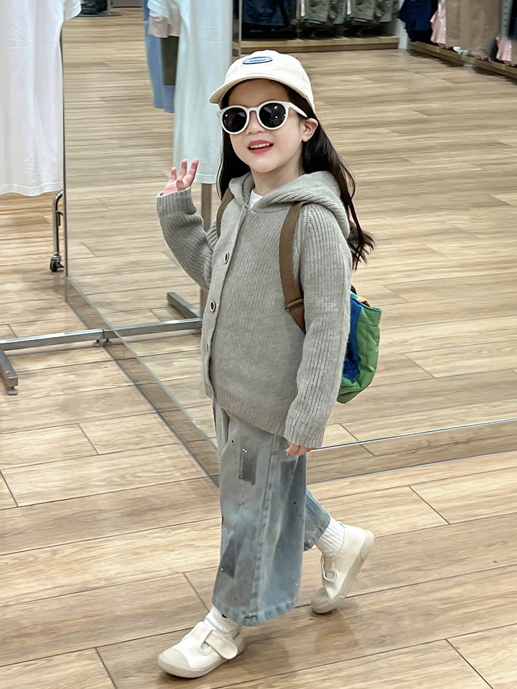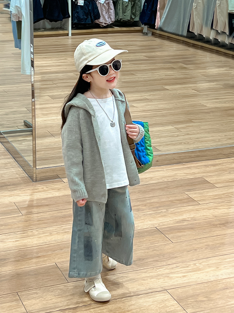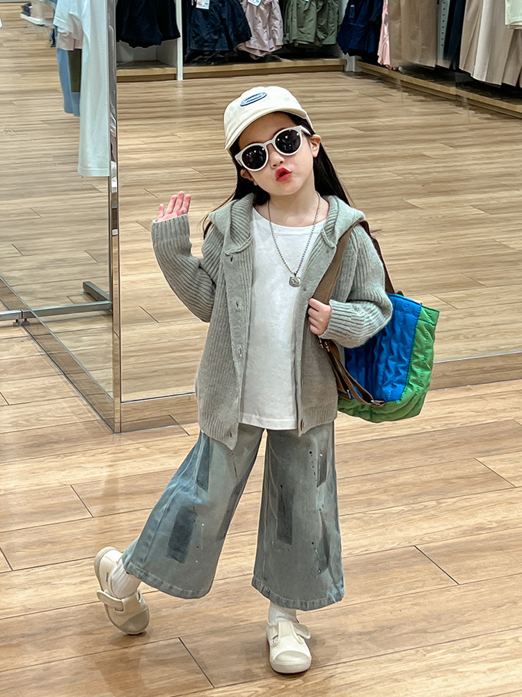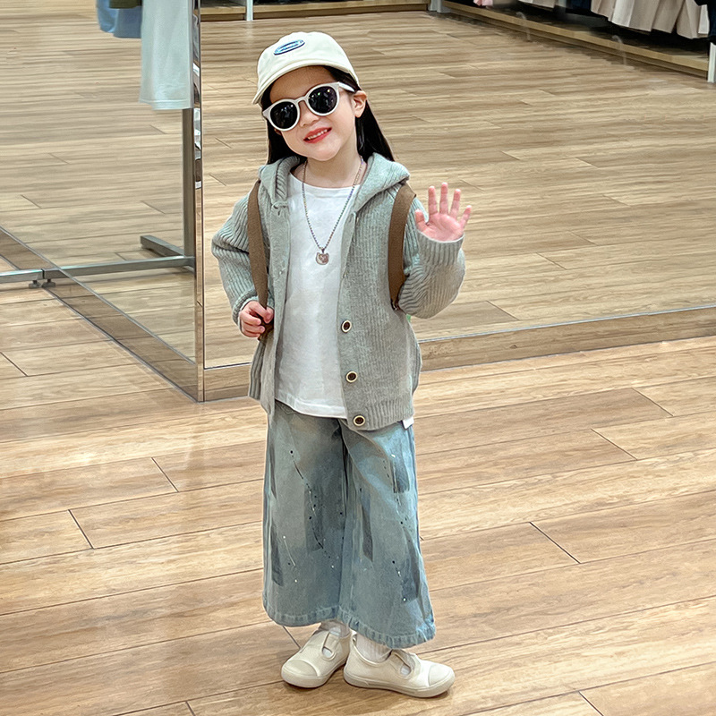 한국 아동복 2024 가을 새 소녀 니트 후드 최고 외국 스타일 디자인 스플래시 잉크 청바지 세트스토어 가기