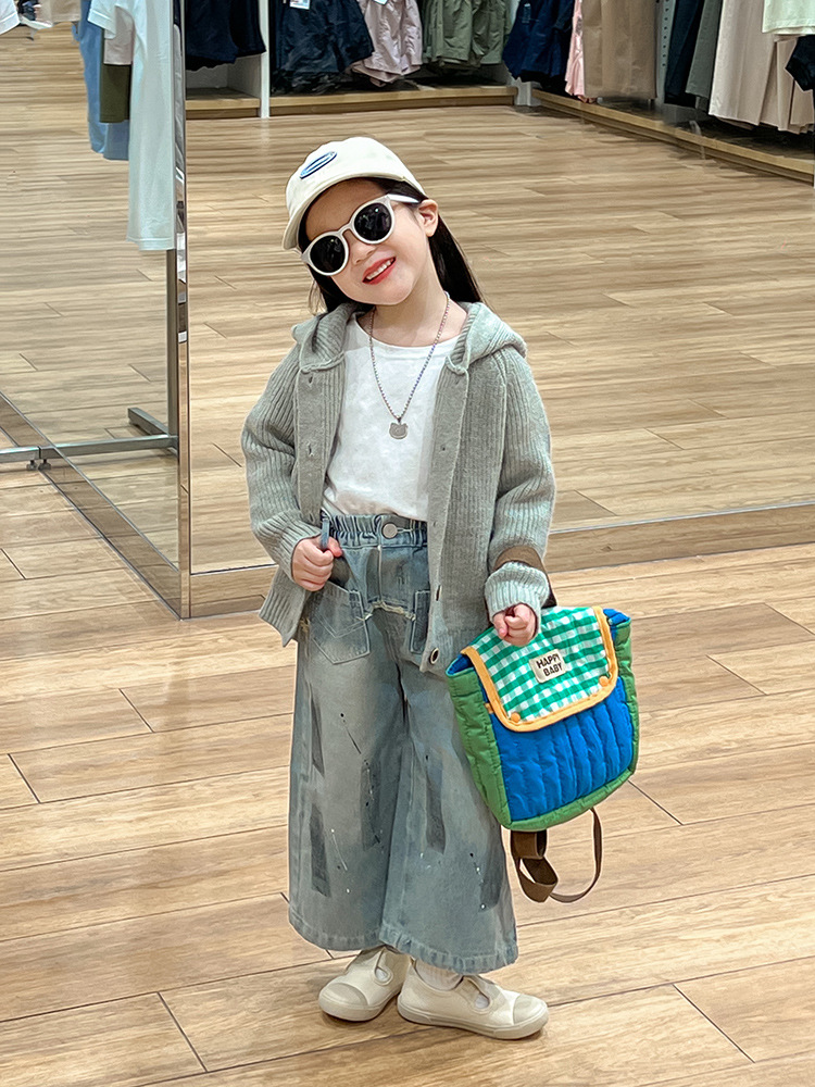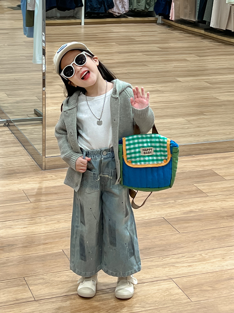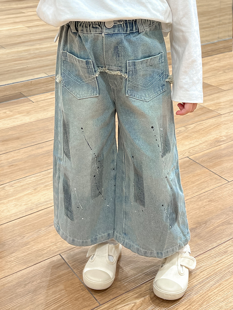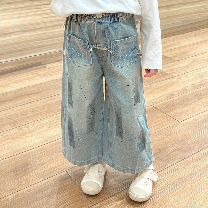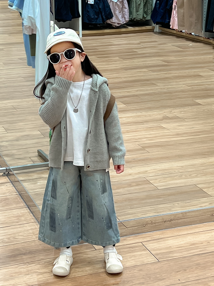한국 아동복 2024 가을 새 소녀 니트 후드 최고 외국 스타일 디자인 스플래시 잉크 청바지 세트스토어 가기