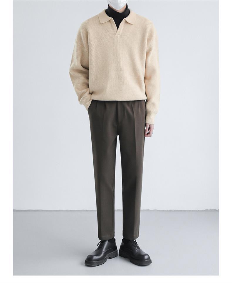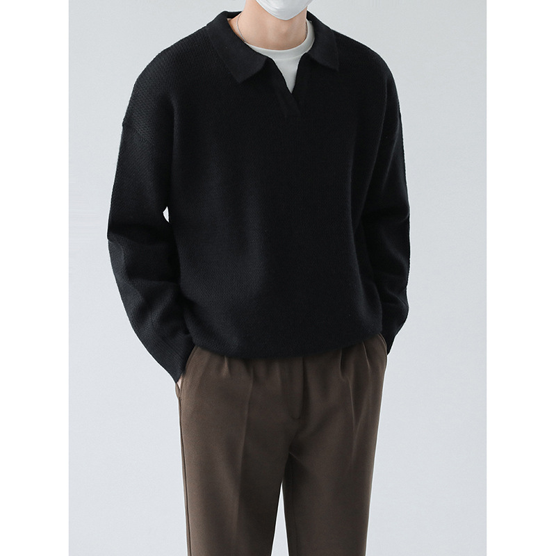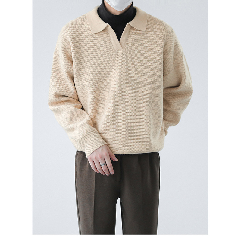 가벼운 성숙한 스타일 단색 폴로 셔츠 남자의 가을과 겨울 인기 옷깃 니트 셔츠 한국 스타일 느슨한 작은 V 넥 캐주얼 스웨터