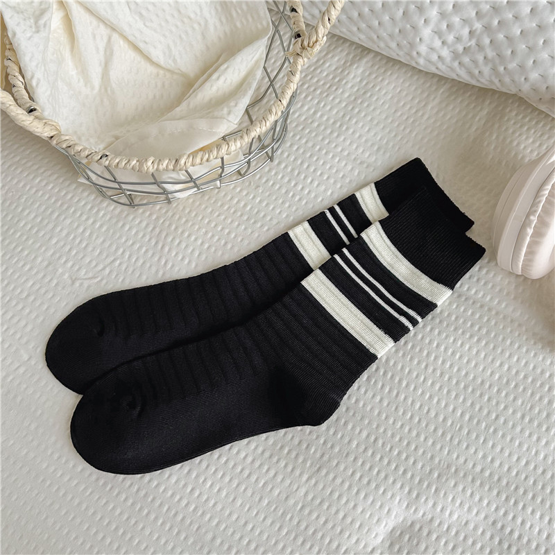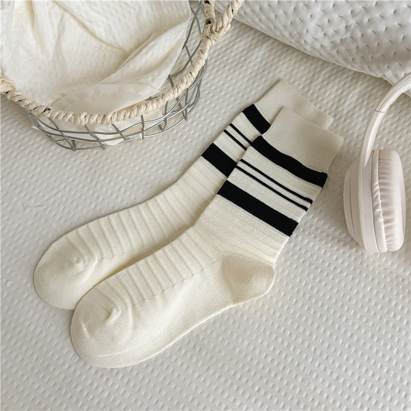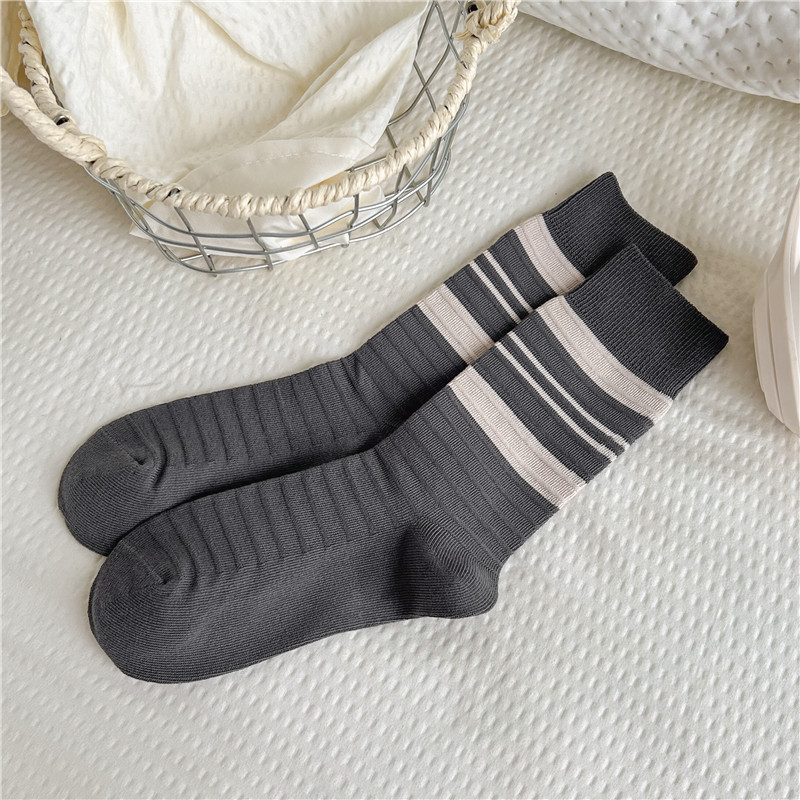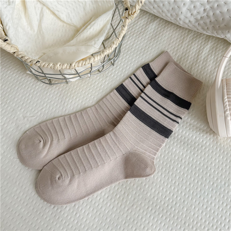 가을 2024 새로운 스타일 양말 여성용 더블 바늘 3 차원 스트라이프 미드 튜브 양말 커피 스타일 복고풍 양말 미드 튜브 양말 일본 스타일