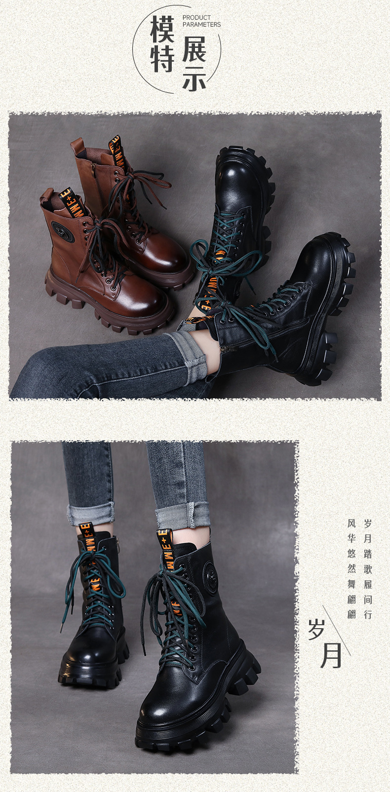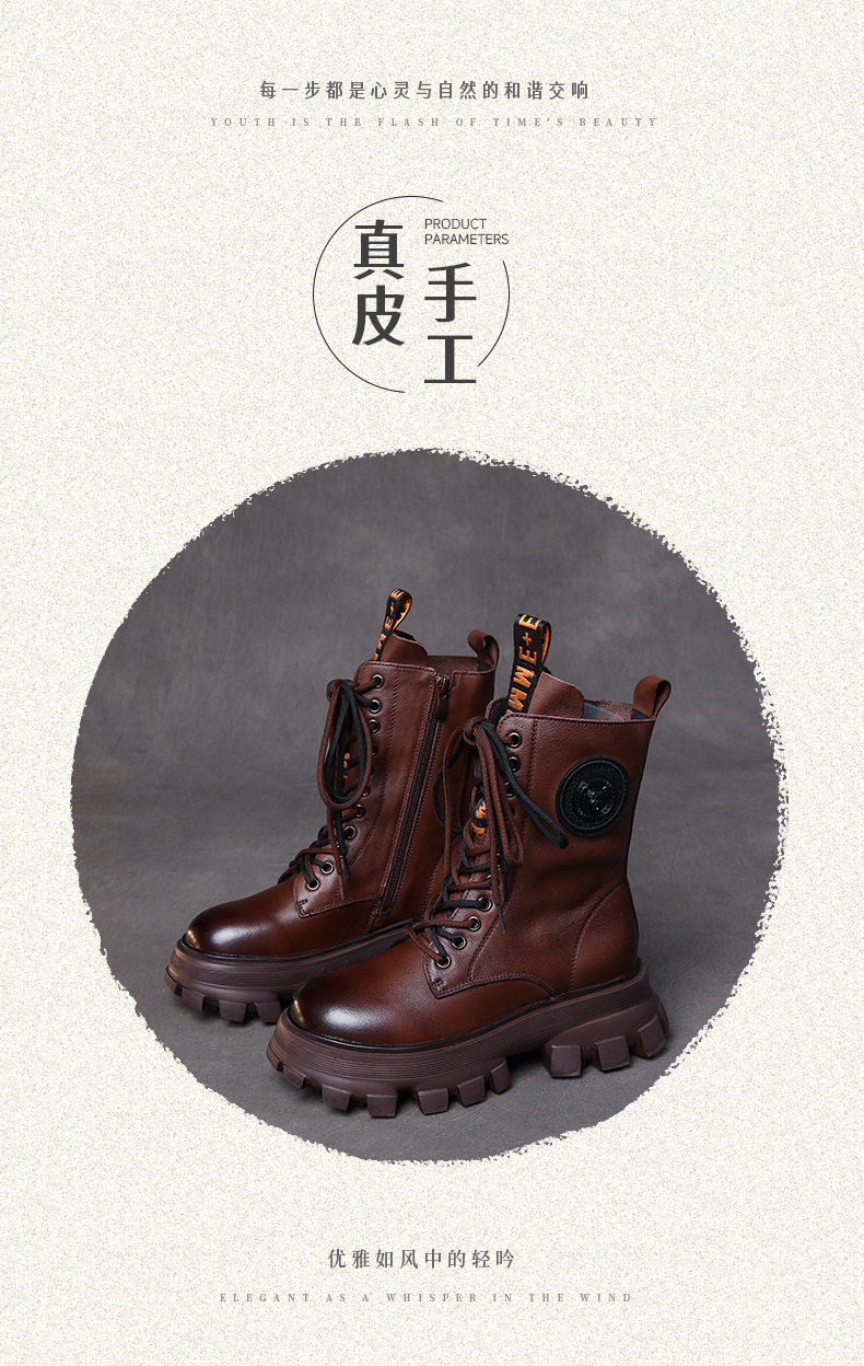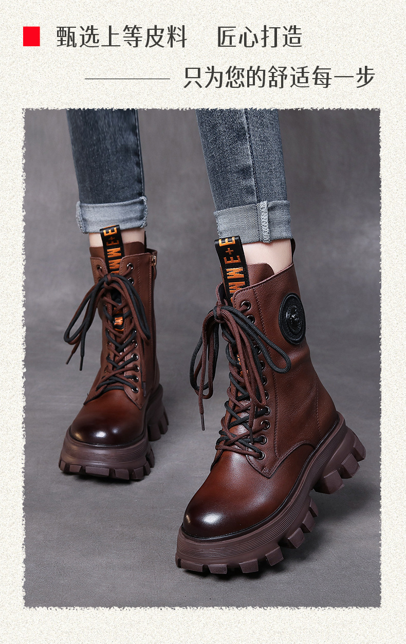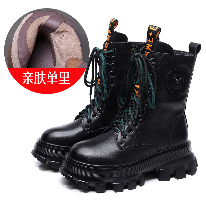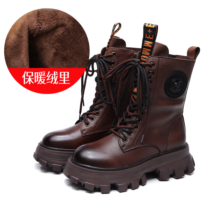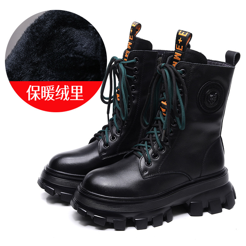 탑 레이어 Cowhide 가을과 겨울 기모 따뜻한 새로운 올 매치 플랫폼 하단 미들 실린더 지퍼 부츠 여성을위한 마틴 부츠스토어 가기