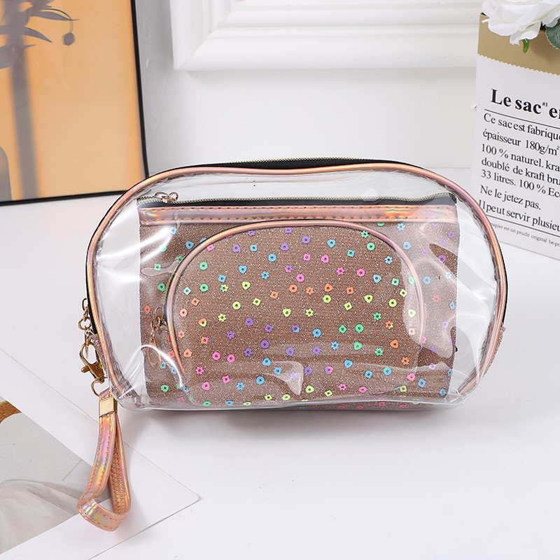 여름 새로운 세퀸 화장품 가방 세트 PVC 투명 3 피스 대용량 여행 보관 가방 세탁 가방스토어 가기