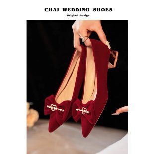 스웨이드 거친 힐 웨딩 신발 여성용 Xiuhe 메인 웨딩 원피스 두 가지 착용 새로운 중국 스타일 레드 피곤하지 않은 발 임산부는 신부 신발을 착용 할 수 있습니다