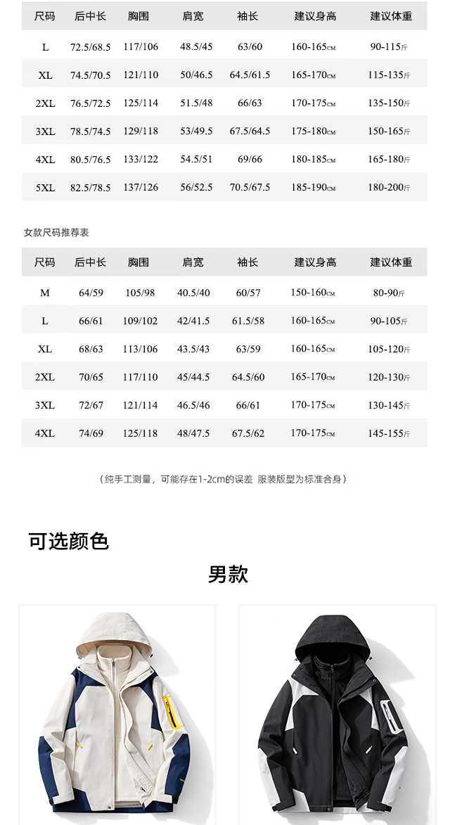 남성과 여성의 새로운 봄, 가을 야외 방풍 재킷 작업복 등산 재킷 라이너 3-in-1 방수 재킷