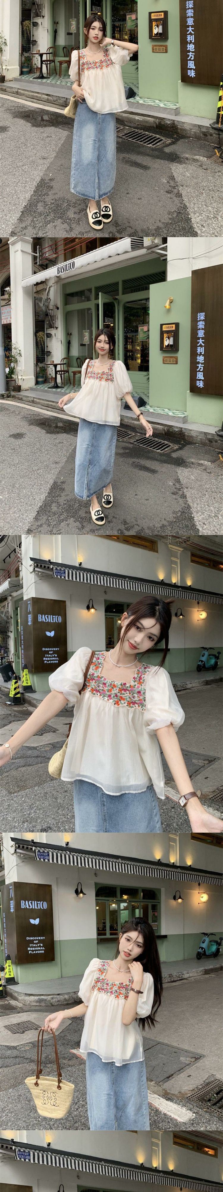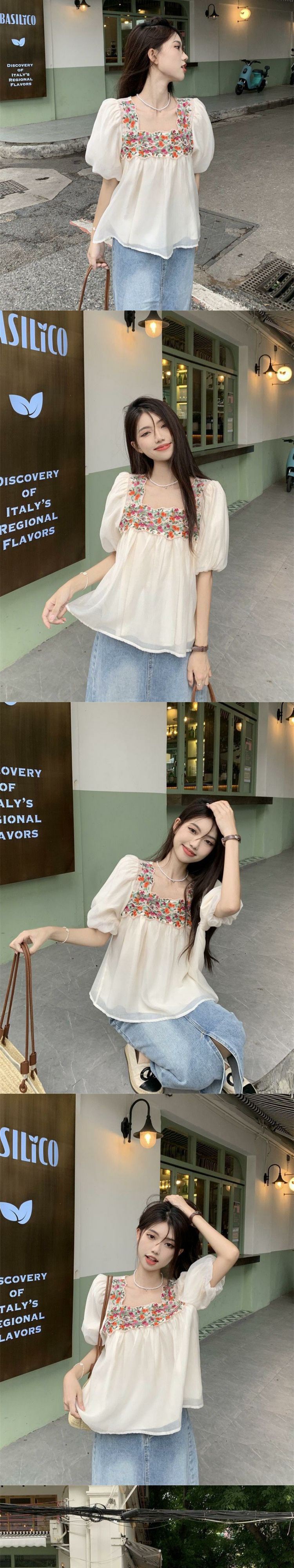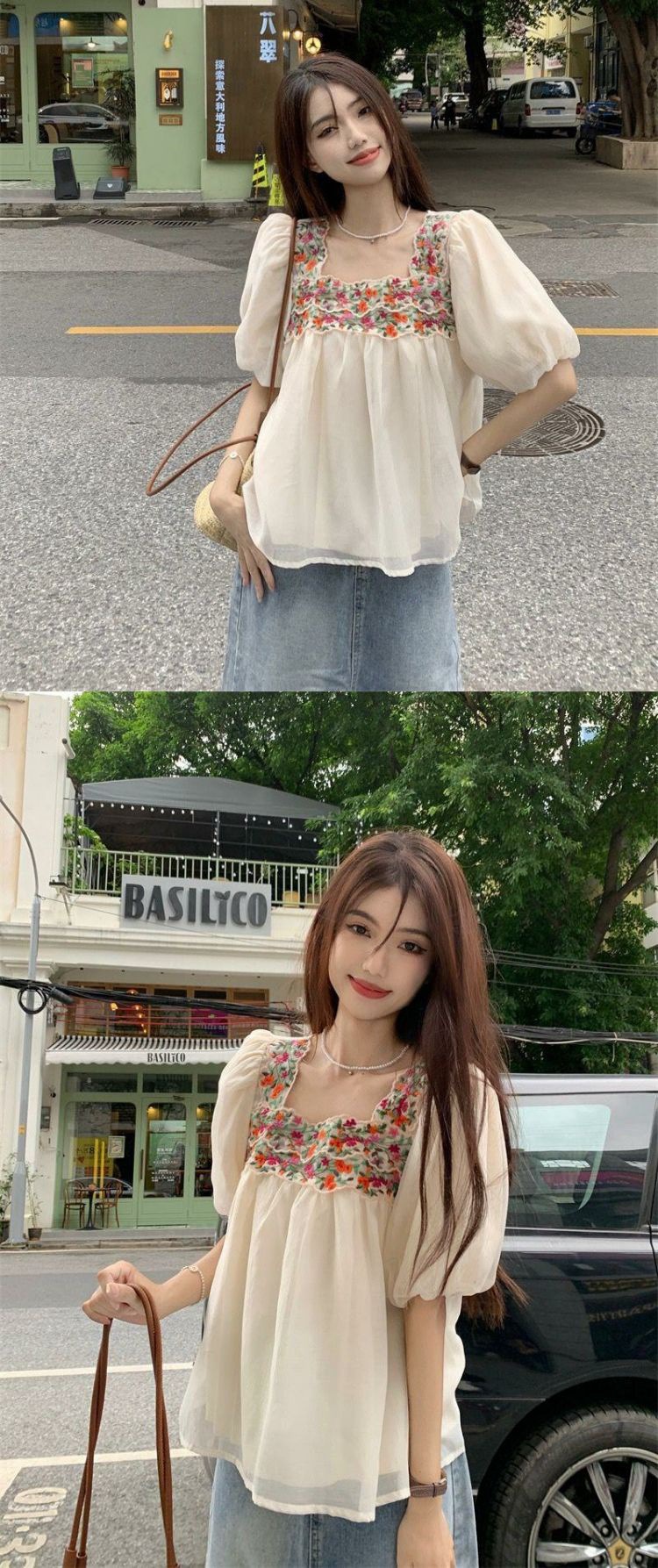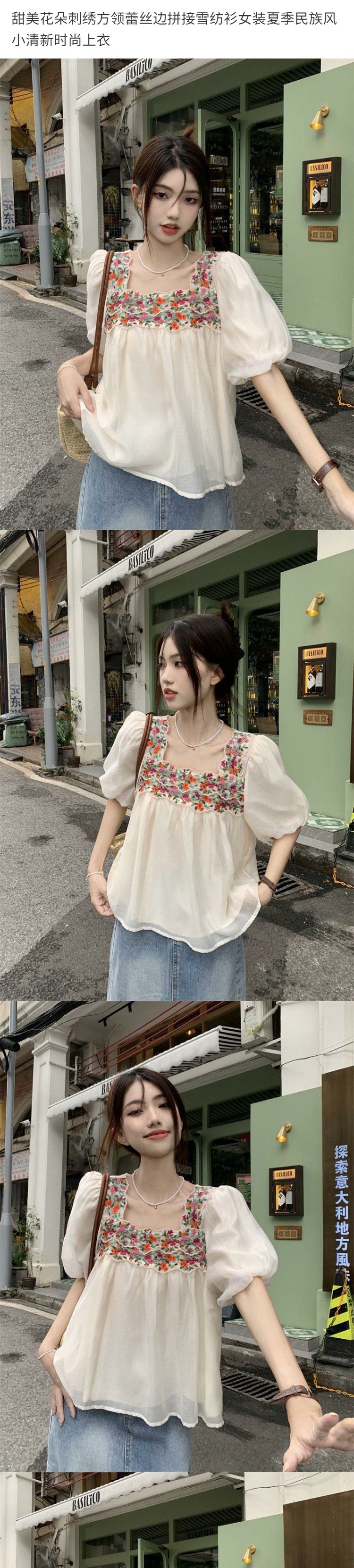 달콤한 꽃 자수 스퀘어 칼라 레이스 엣지 스티칭 쉬폰 셔츠 여성 여름 민족 스타일 신선한 패션 탑스토어 가기