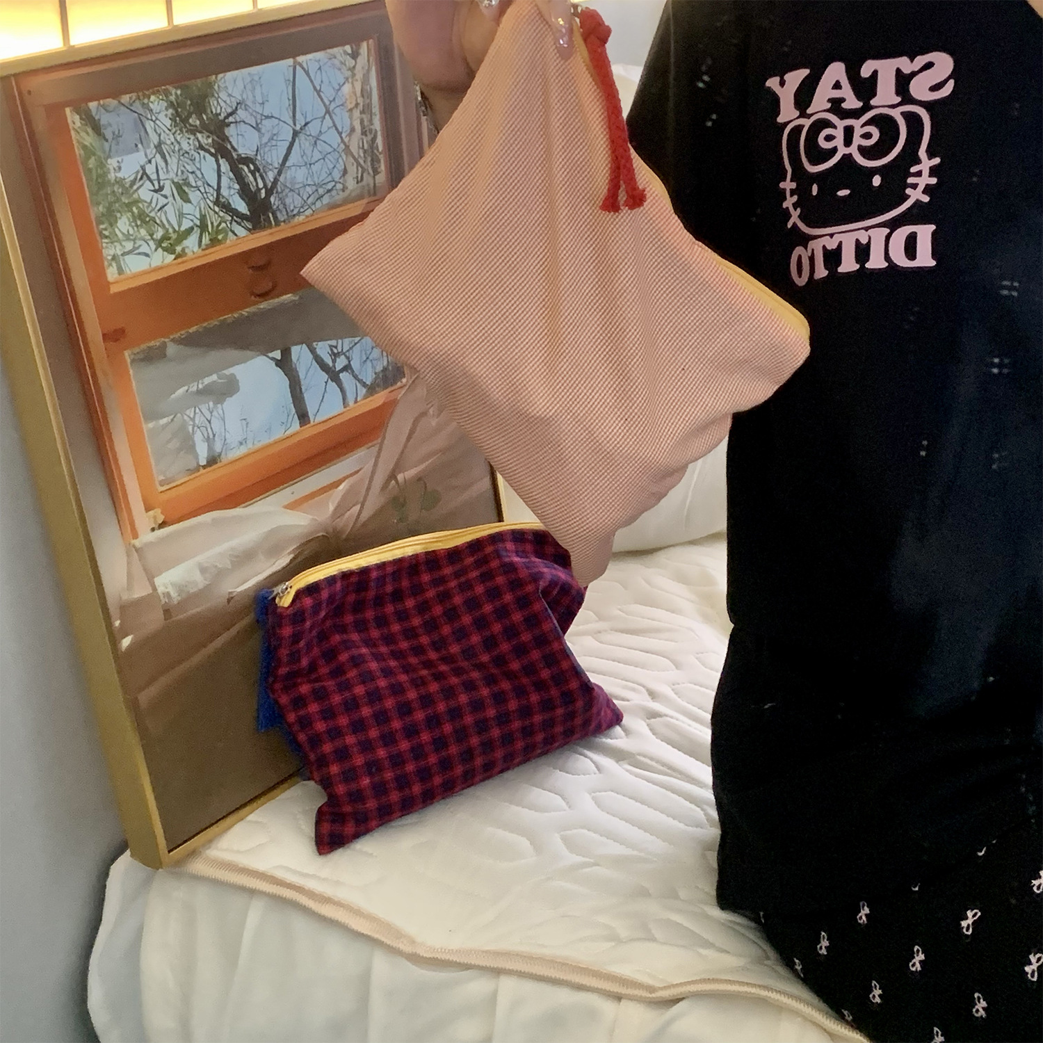 • 오렌지 체크 무늬 수납 가방