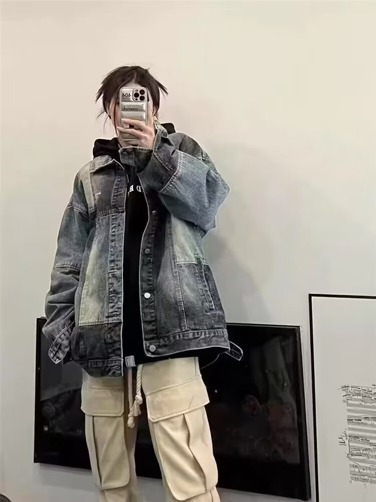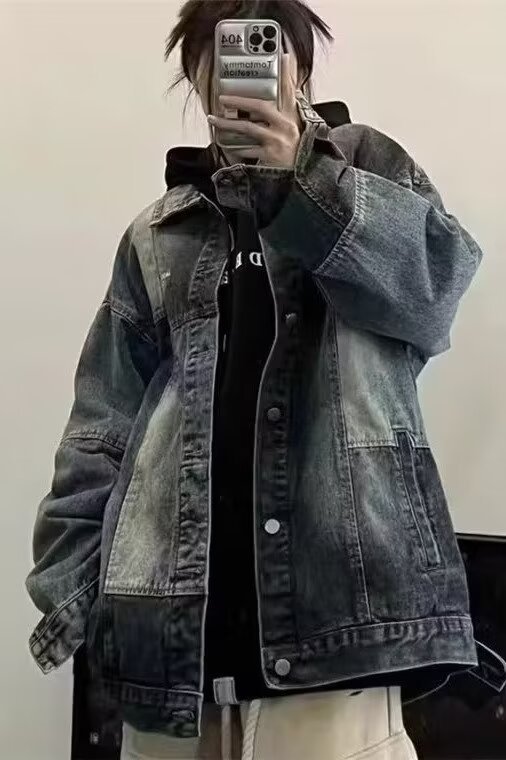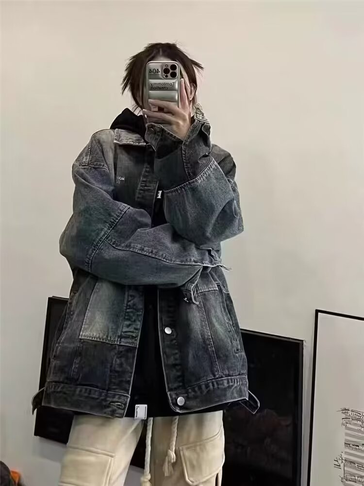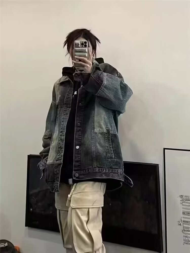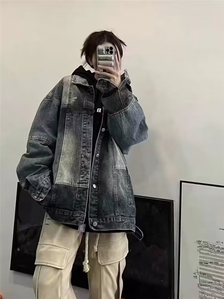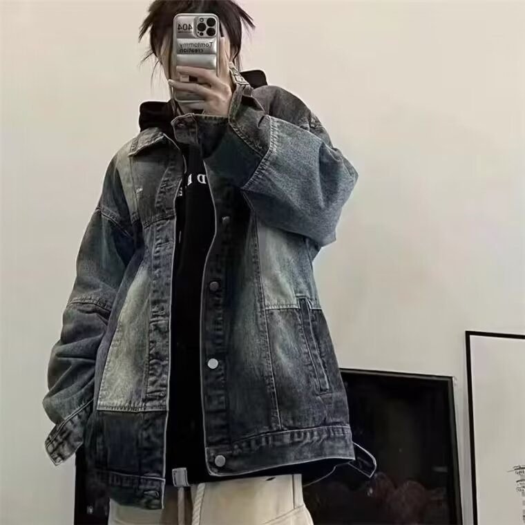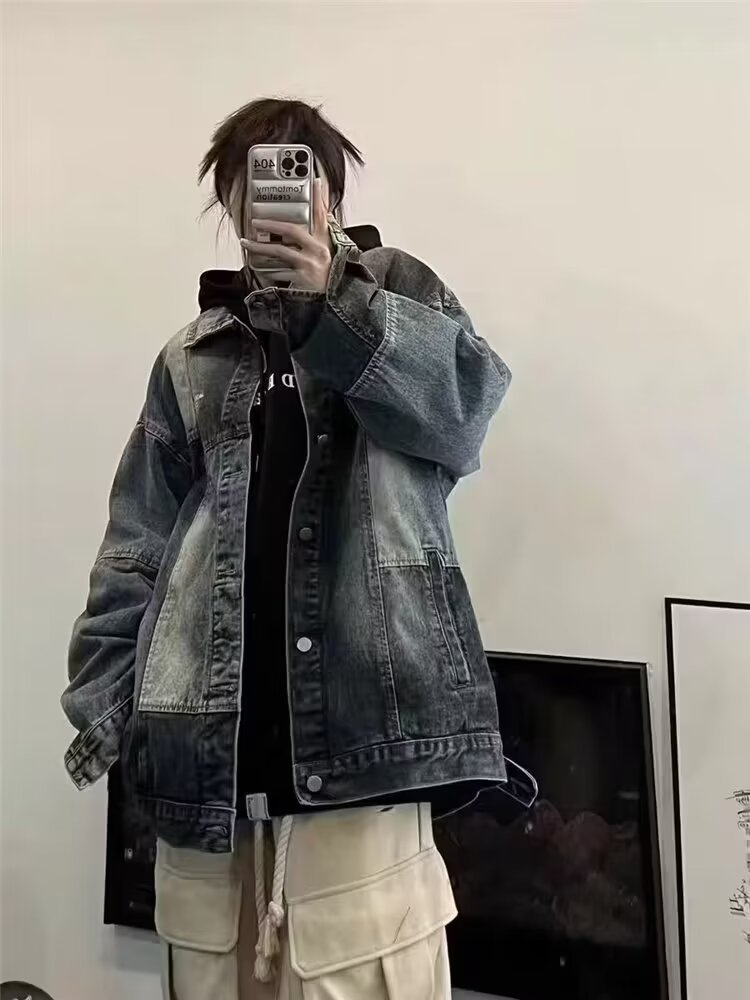 재킷 원피스 도매 레트로 블루 스티칭 데님 재킷 남성 가을 느슨한 틈새 디자인 색상 매칭 데님 재킷스토어 가기
