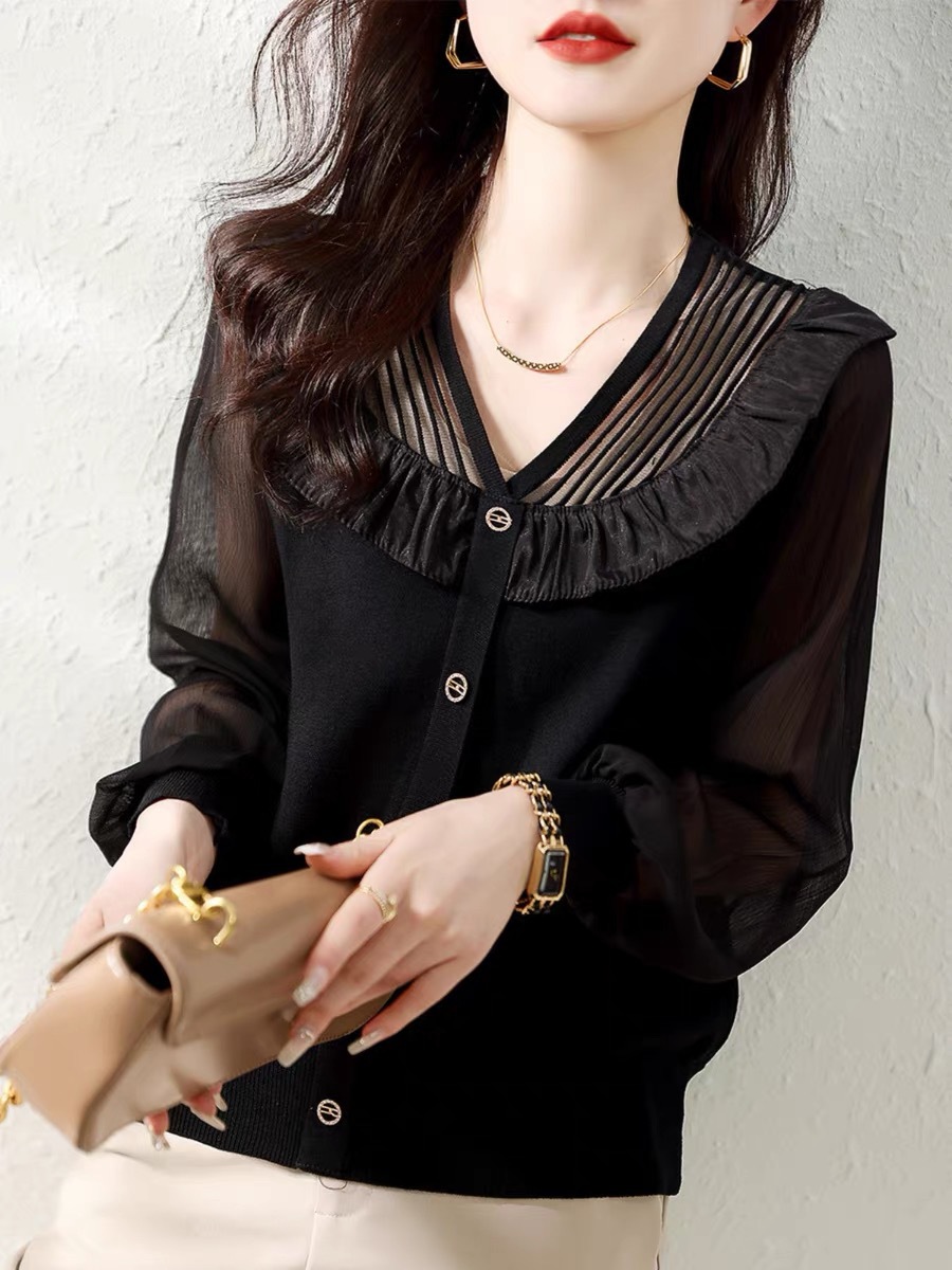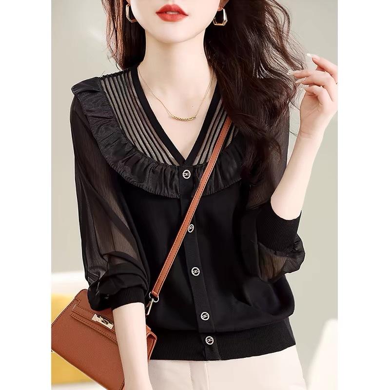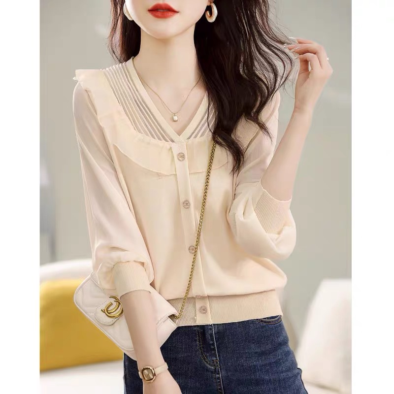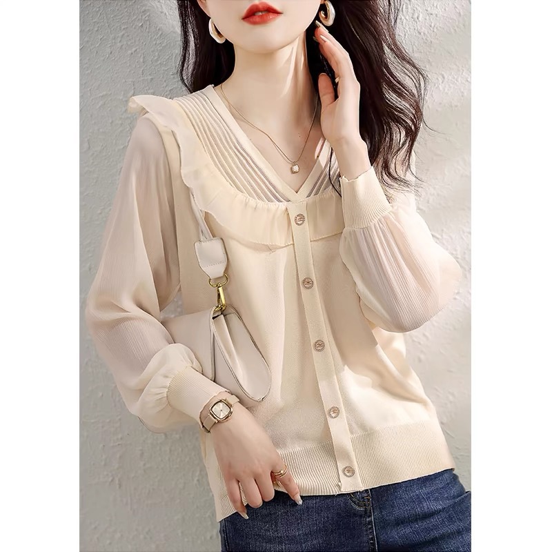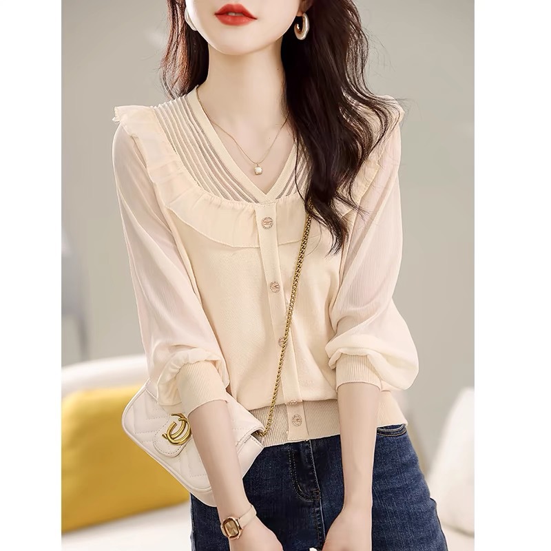 샤넬 스타일 니트 카디건 여성용 봄 새 스타일 스티칭 쉬폰 블라우스 우아한 달콤한 러플 롱 슬리브 탑