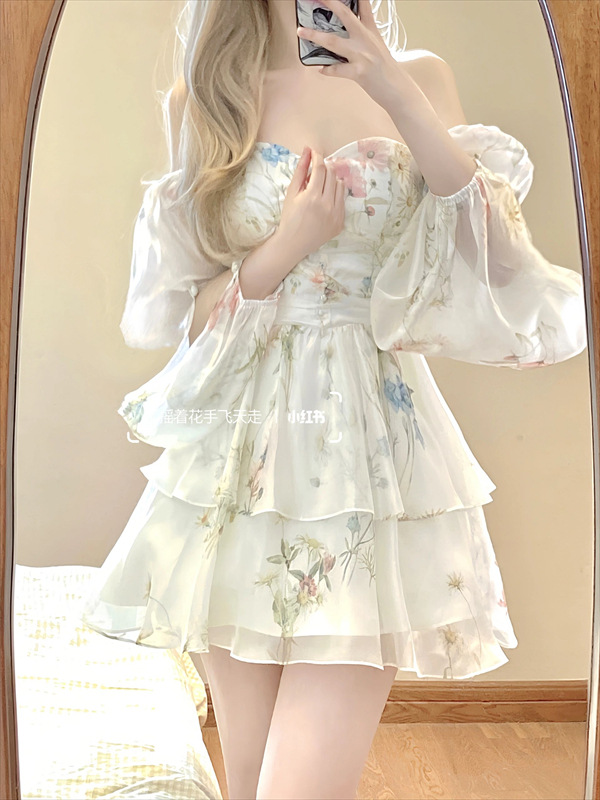 달콤한 요정 긴 소매 쉬폰 원피스 여성의 2024 가을 새로운 순수한 섹시한 흰색 꽃 짧은 원피스스토어 가기