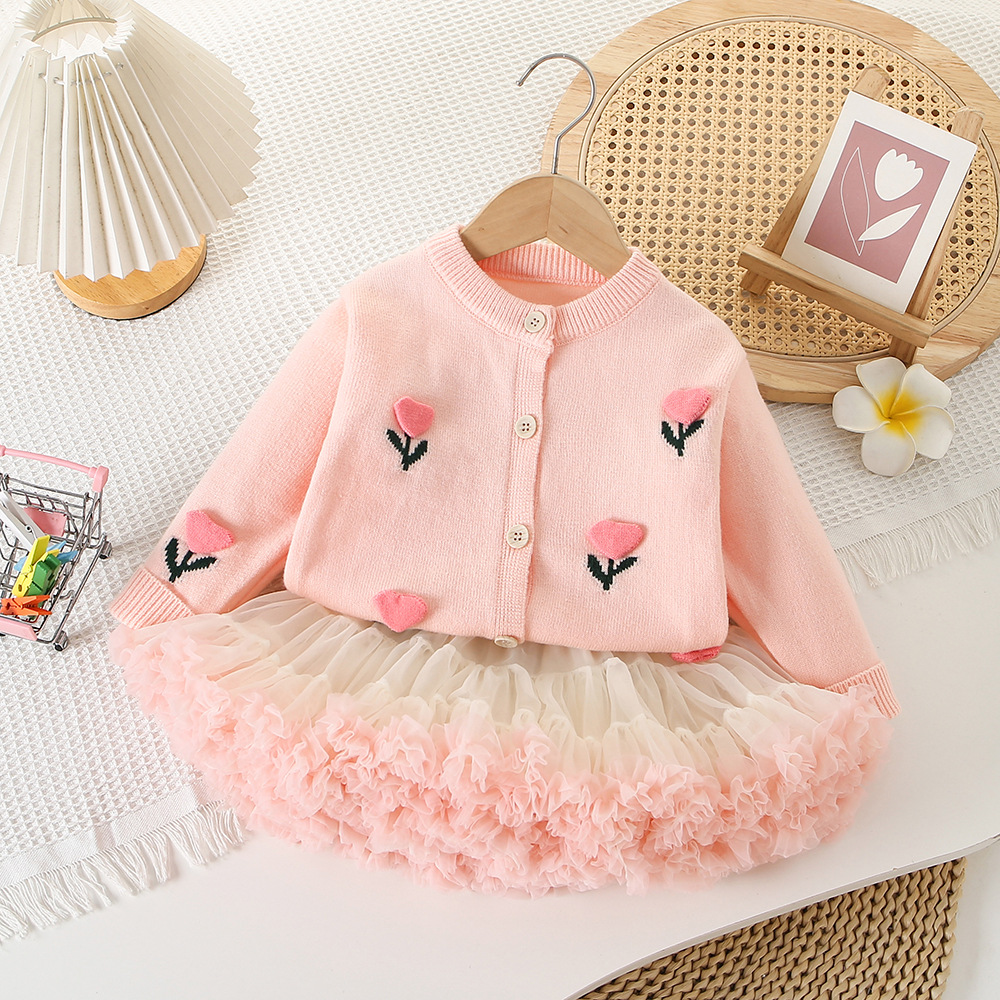 여아 스웨터 가디건, 사랑스러운 꽃무늬 니트 재킷, 가을 겨울 신상 여아 한국 스타일 스위트 탑, 메쉬 스커트