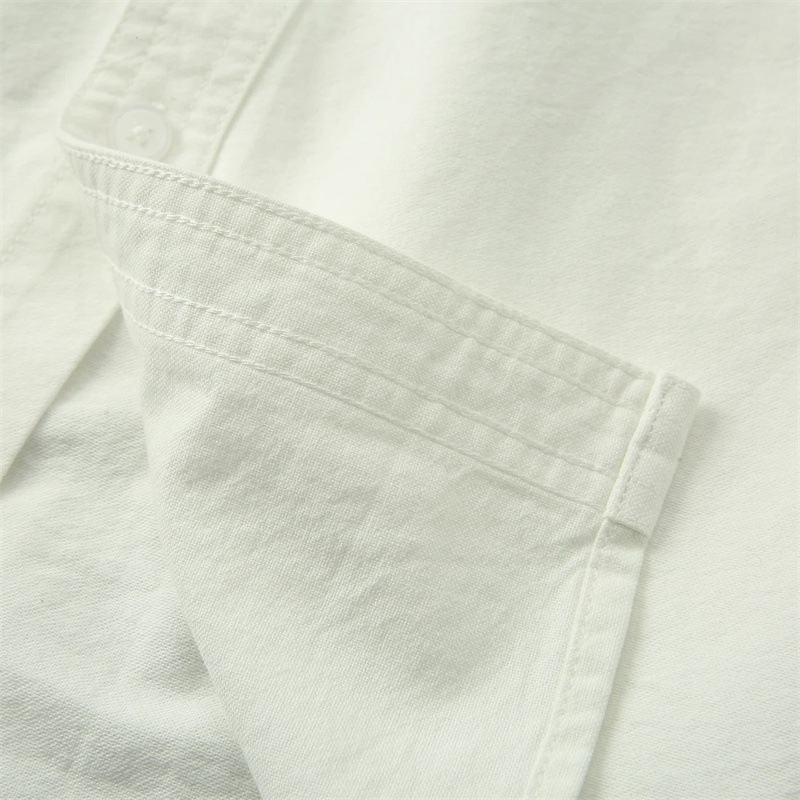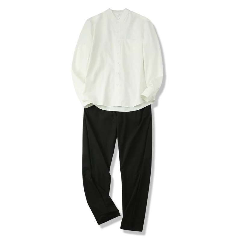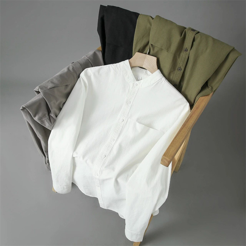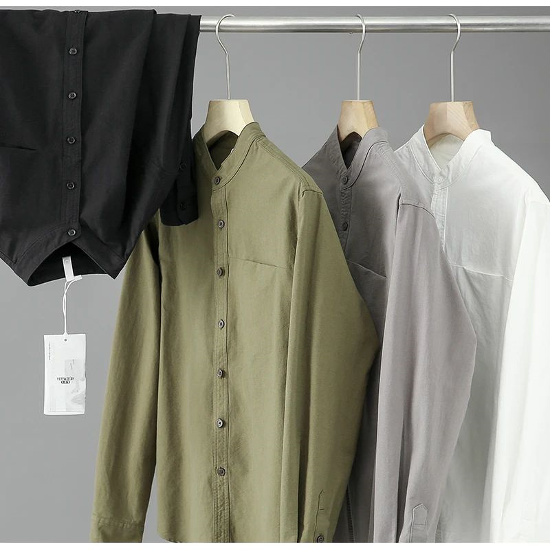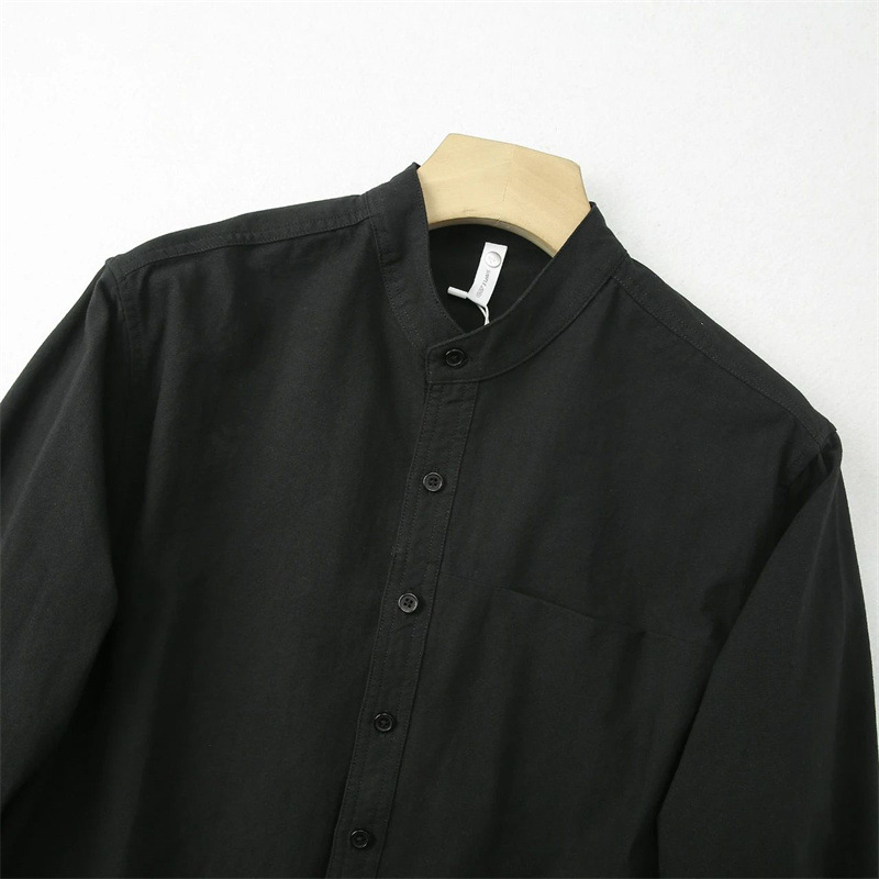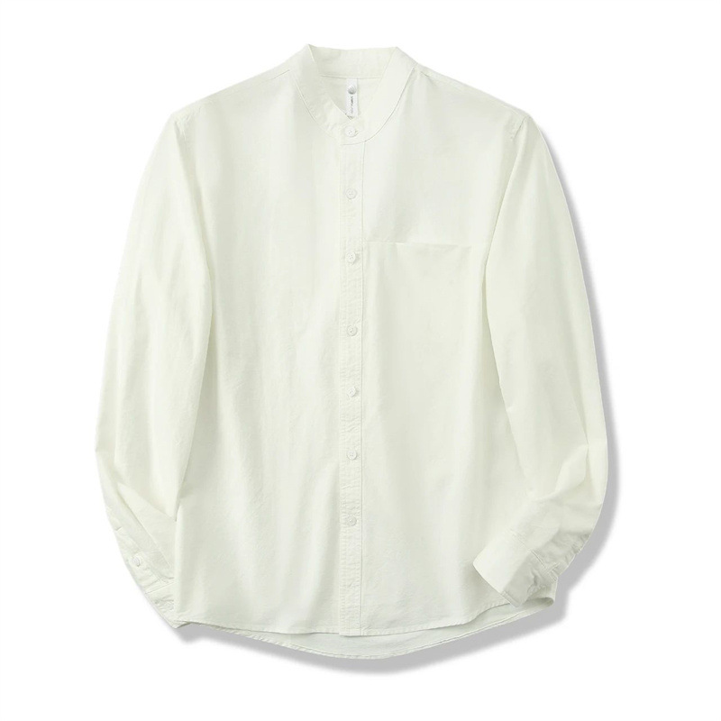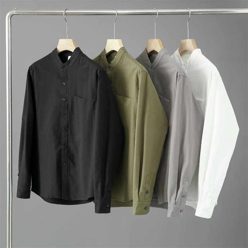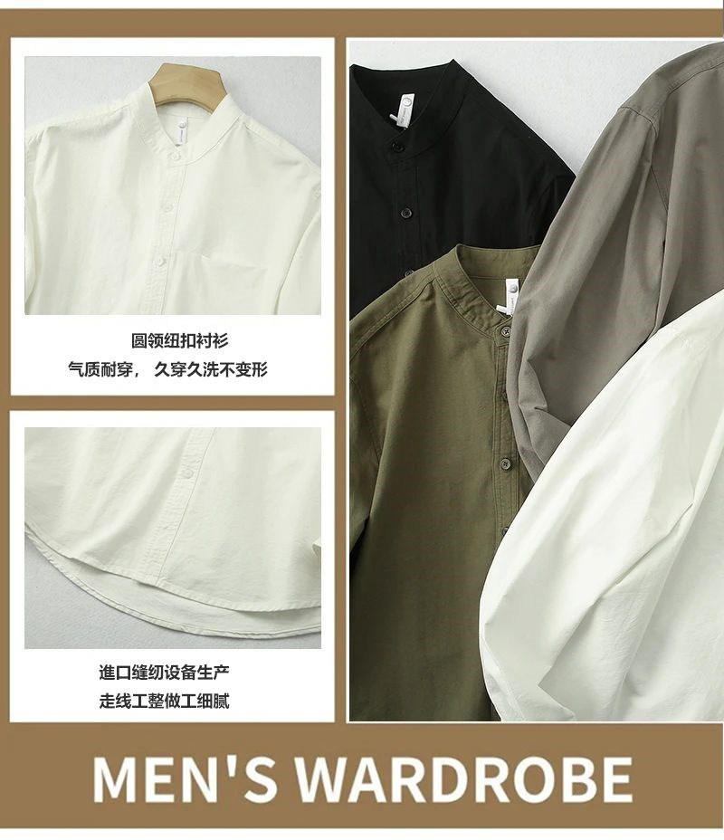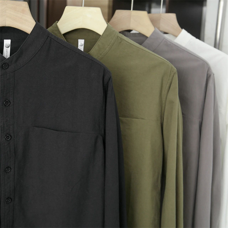 젊고 중년 헨리 칼라 100 면 더블 원사 편안한 통기성 가을 남자 복고풍 칼라 캐주얼 긴팔 트렌디 셔츠