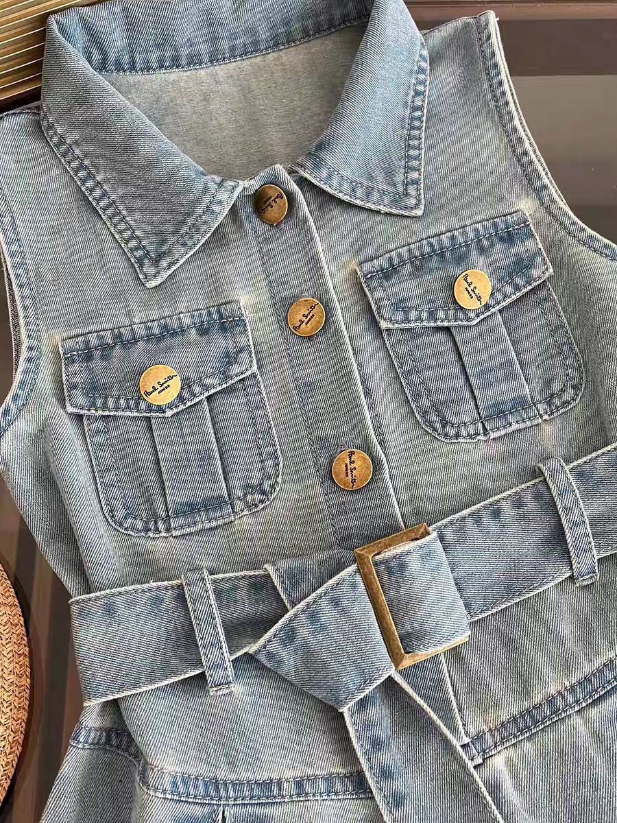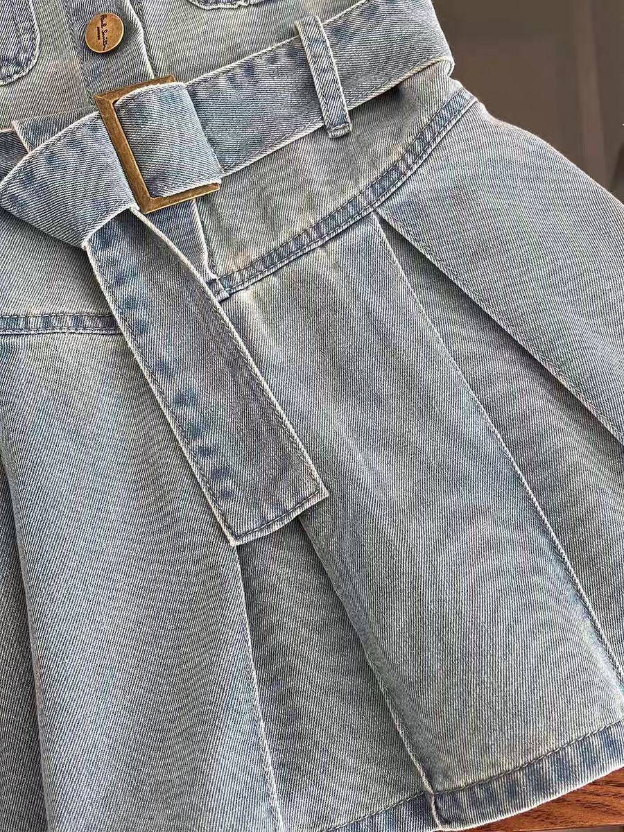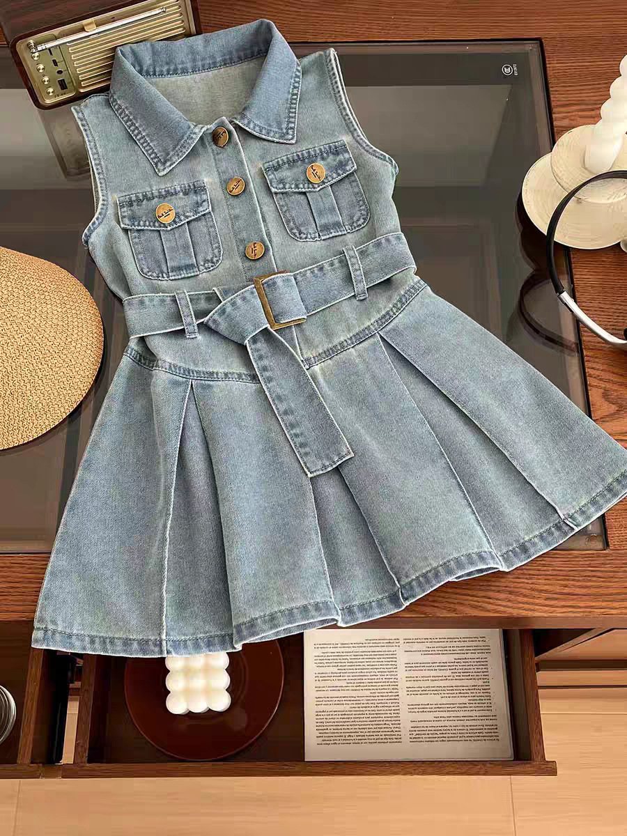 2024 여자 새로운 아동복 원피스 패션 벨트 데님 원피스 아기 소녀 조끼 원피스