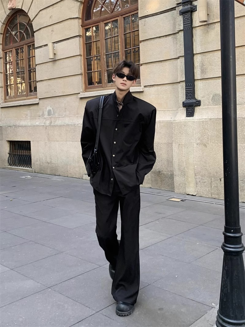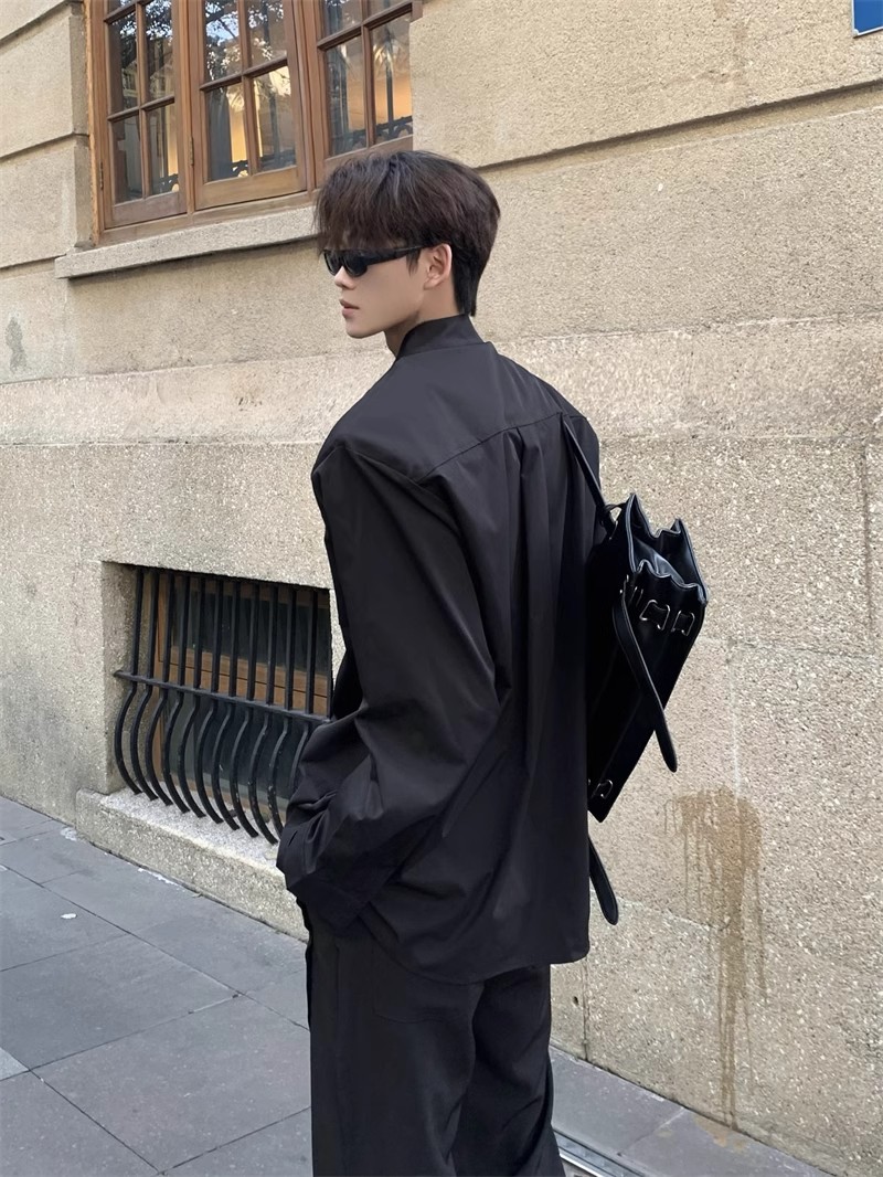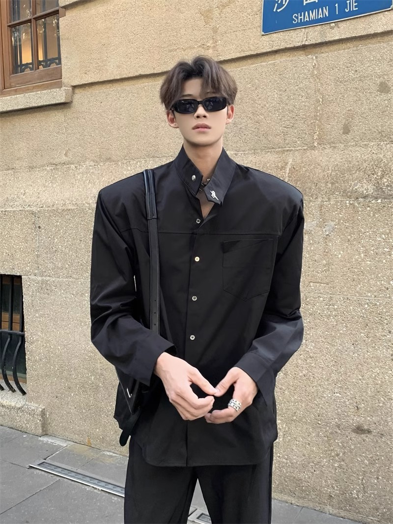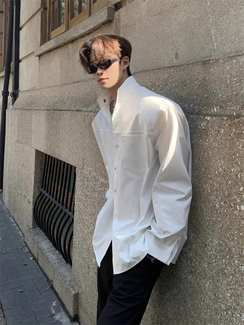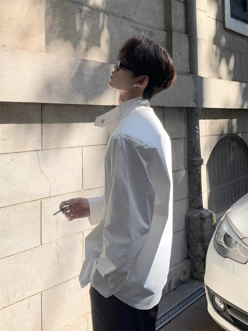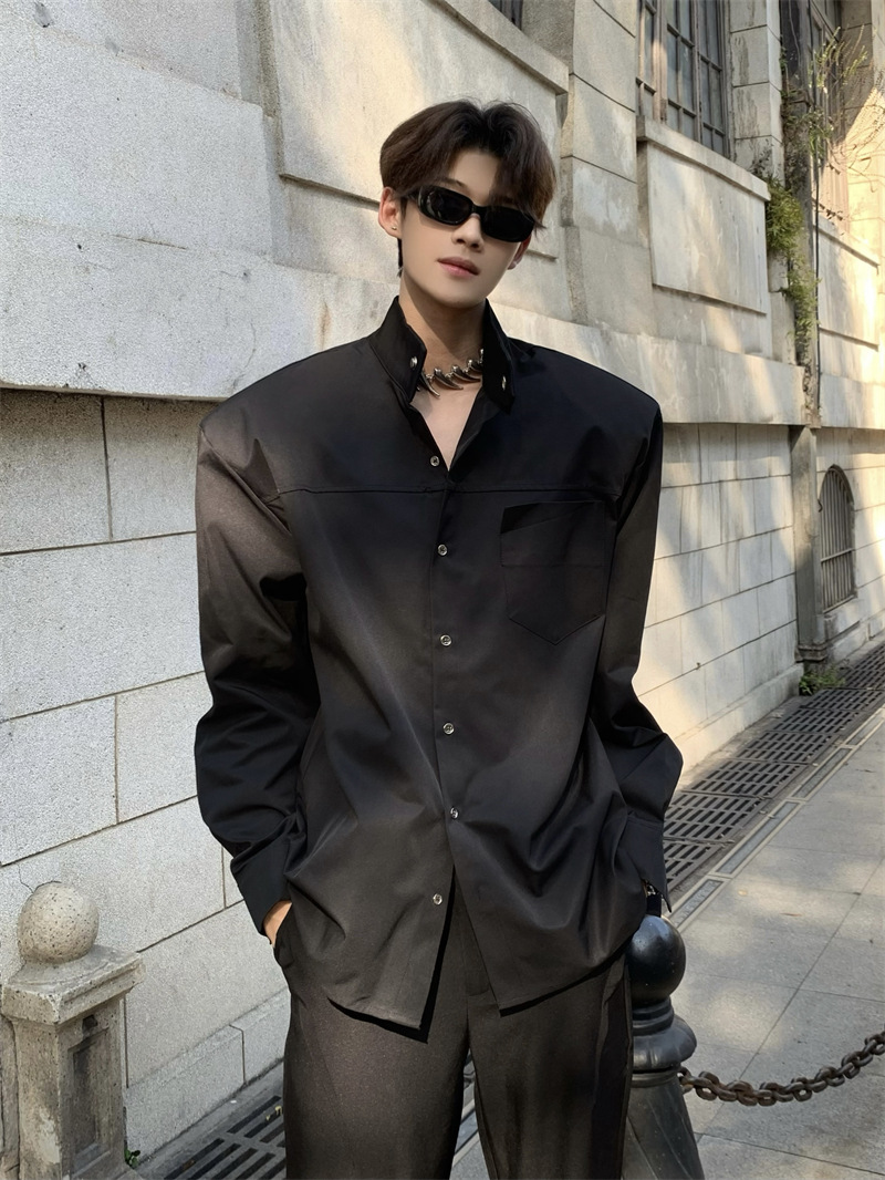 간단한 디자인 금속 버클 칼라 셔츠 남자의 가을 하이 엔드 느슨한 솔리드 컬러 슬랜트 포켓 숄더 패드 긴 소매 셔츠