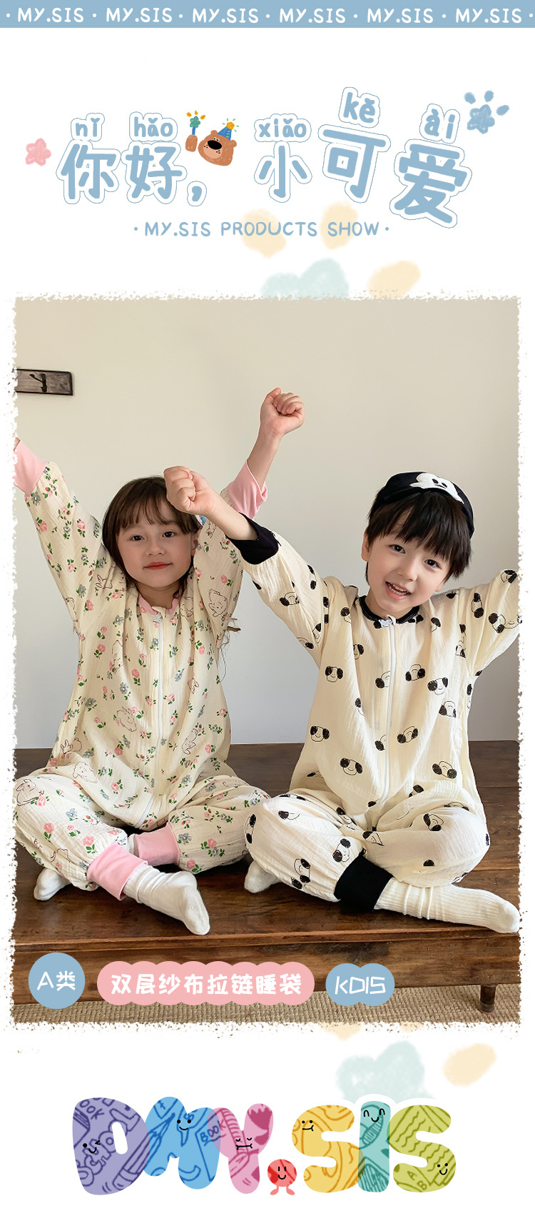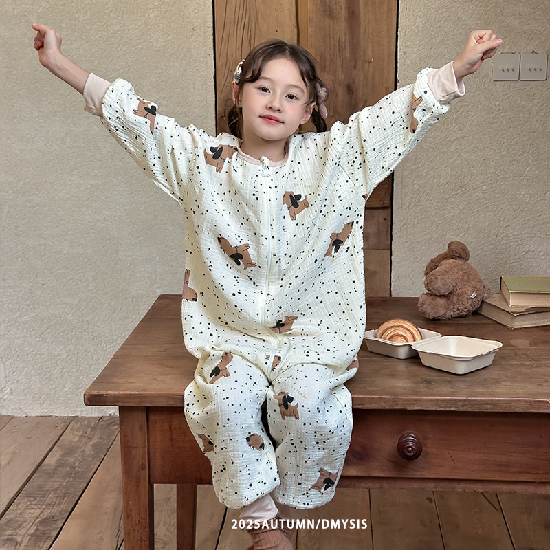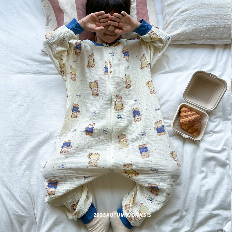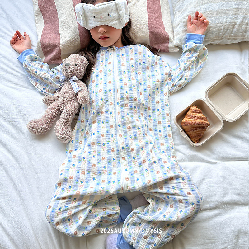 25MYSIS 가을 어린이용 이중 거즈 순면 분리형 수면복 아기 배 보호 수면복 원피스 홈웨어