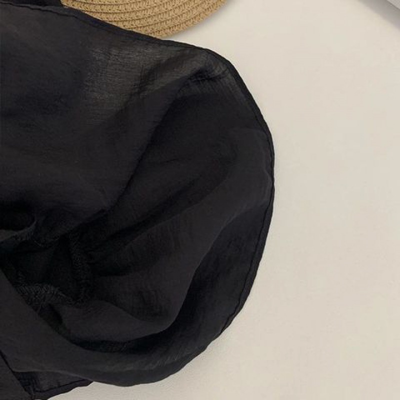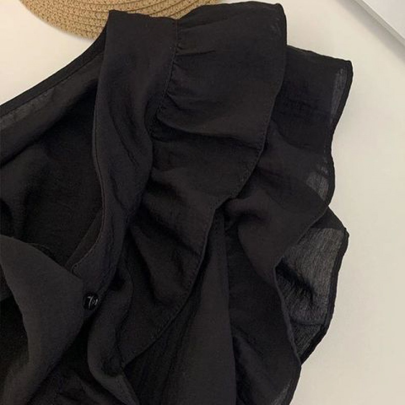 러플 V 넥 쇼트 쉬폰 셔츠 여자 2023 년 여름 새로운 한국식 올매치 에이지 감소 인형 셔츠 블랙 탑