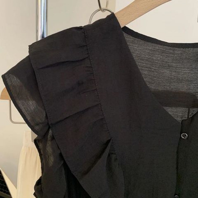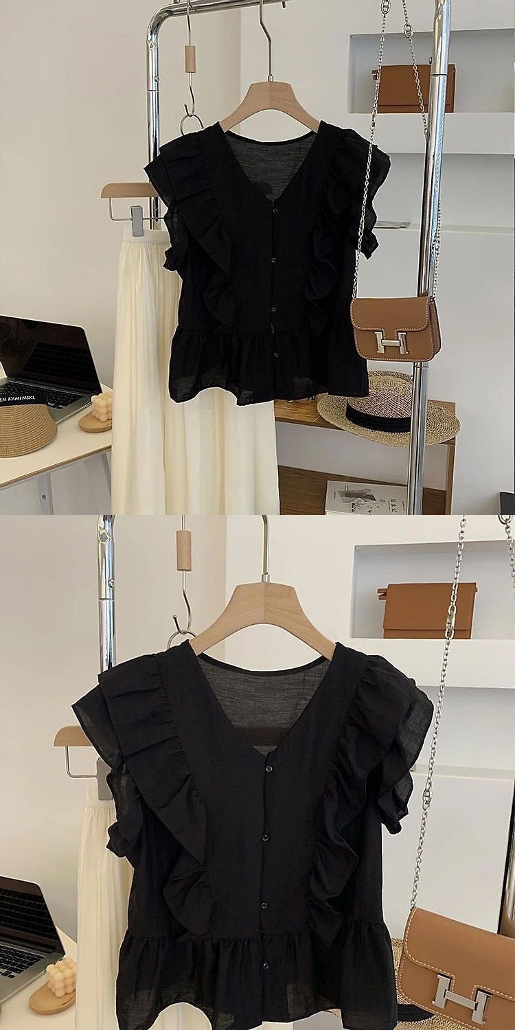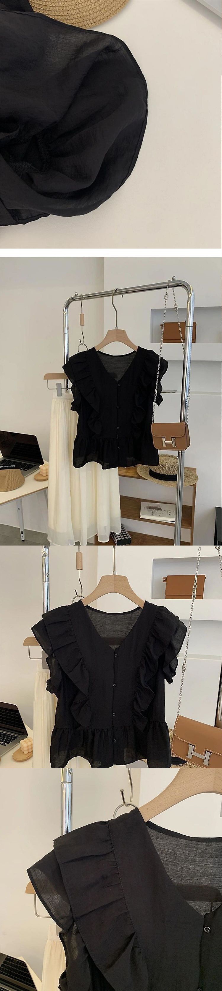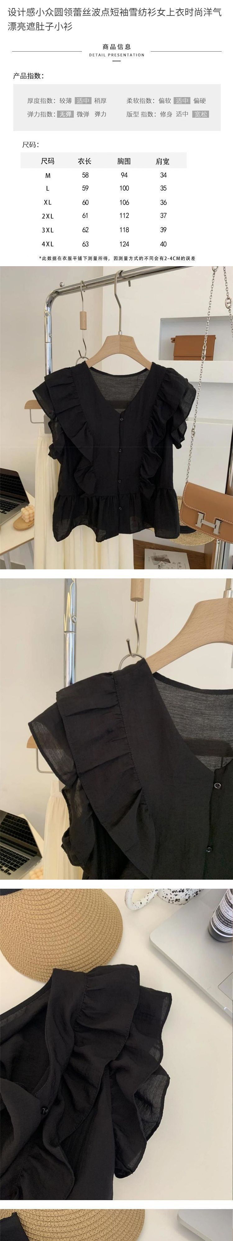 러플 V 넥 쇼트 쉬폰 셔츠 여자 2023 년 여름 새로운 한국식 올매치 에이지 감소 인형 셔츠 블랙 탑스토어 가기