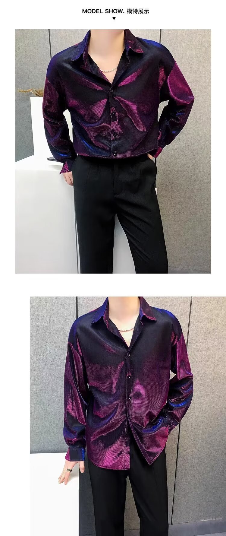 가을 빛 원래 패션 브랜드 개성 밝은 색상 시원한 러피 잘 생긴 노철 셔츠 남성 패션 스팽글 틈새 셔츠 패션스토어 가기
