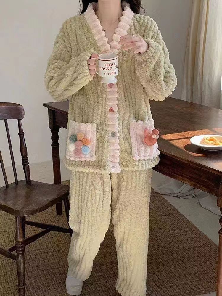 2024 여성 가을, 겨울 게으른 스타일 레인보우 버튼 카디건 잠옷 파자마 스위트 홈웨어 투피스 슈트스토어 가기