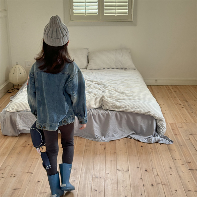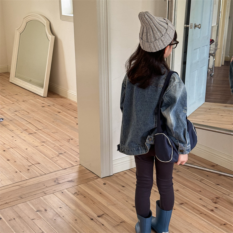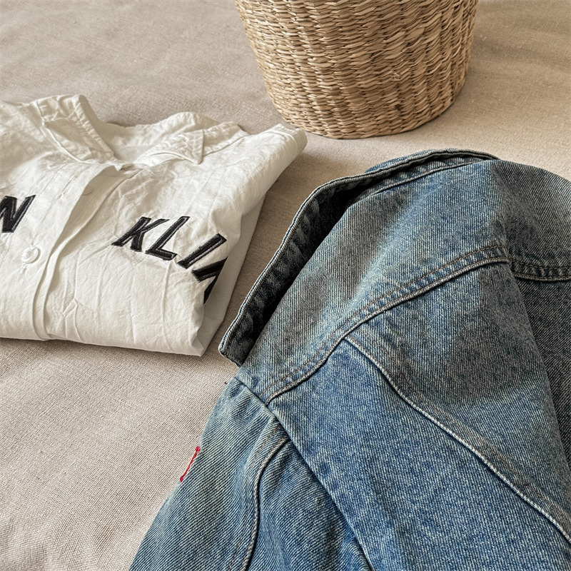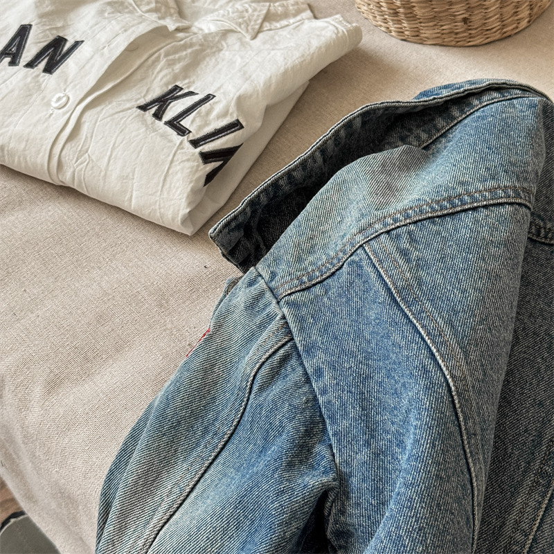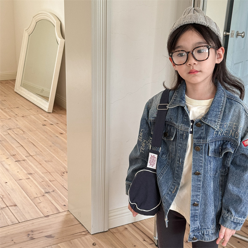 가을 2024 어린이 데님 코트 자수 그림 서양 스타일 빈티지 소년 소녀를위한 영국 데님 카디건 재킷