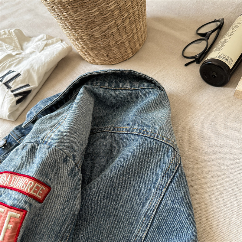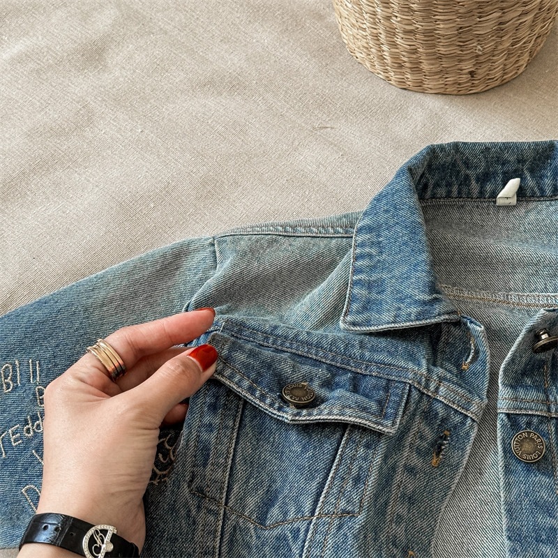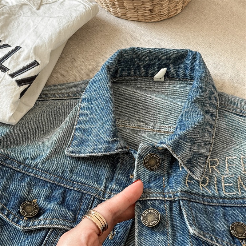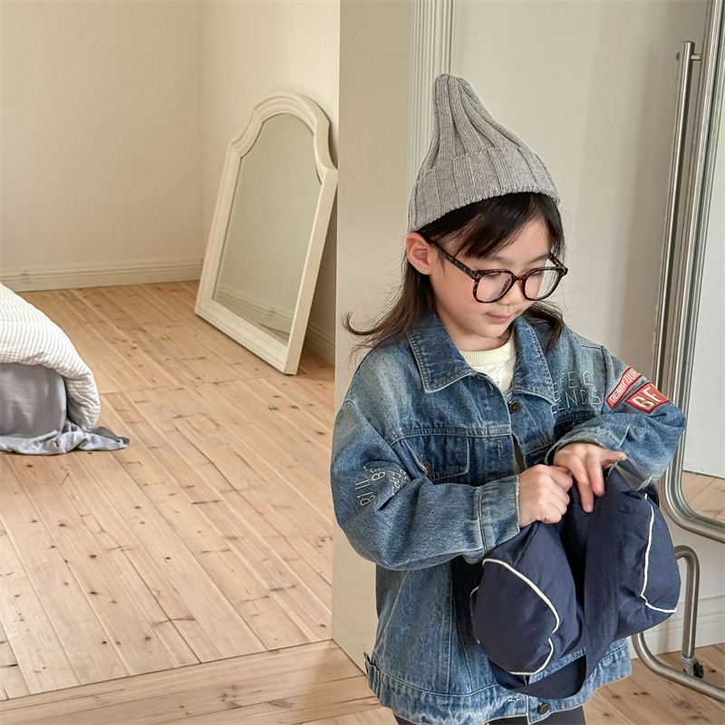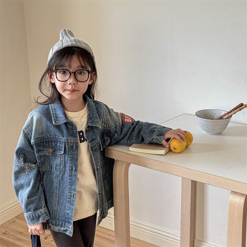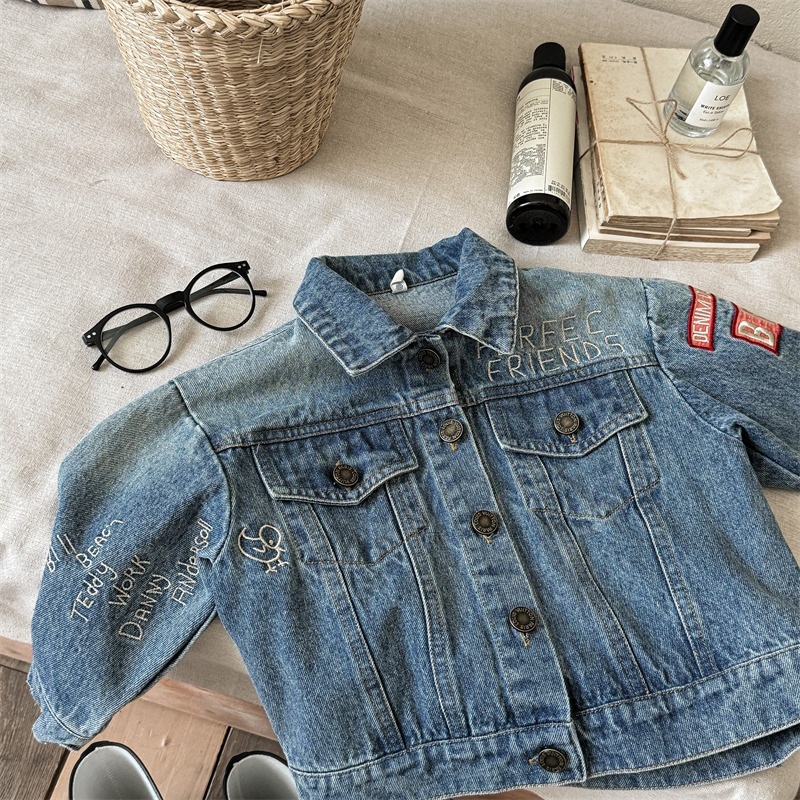 가을 2024 어린이 데님 코트 자수 그림 서양 스타일 빈티지 소년 소녀를위한 영국 데님 카디건 재킷스토어 가기