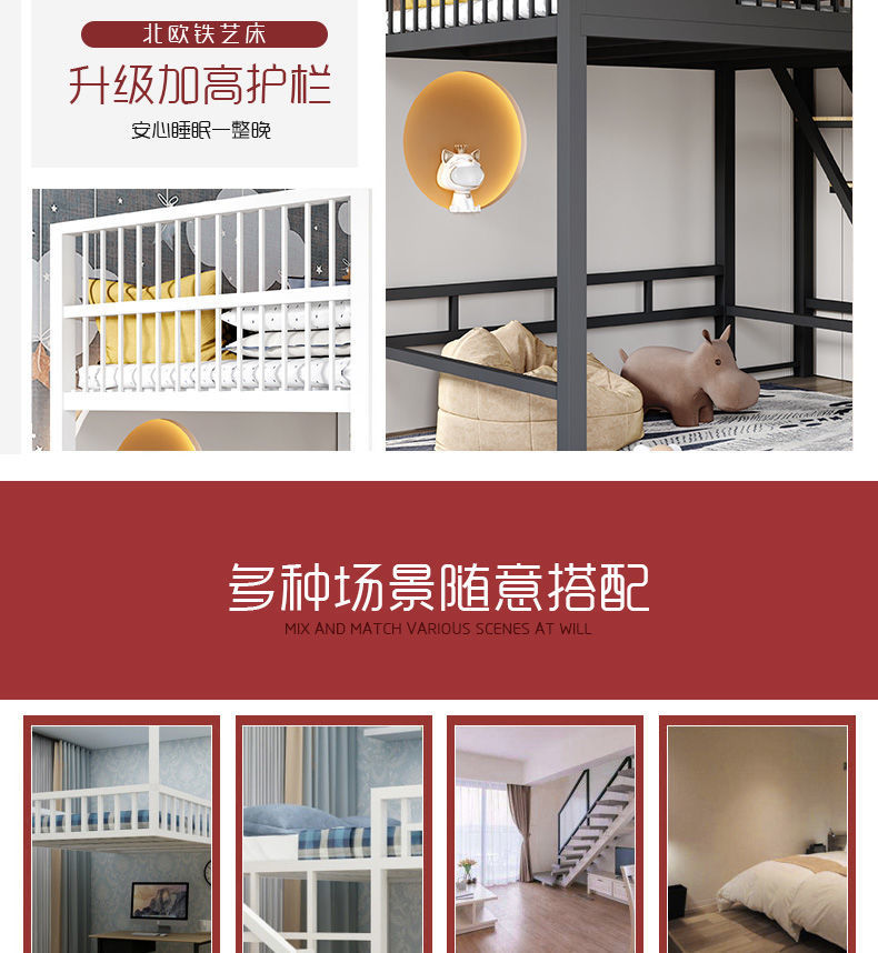 FLE 노르딕 두꺼운 철 프레임 침대 작은 아파트 공간 절약형 철 침대 높고 낮은 침대 듀플렉스 싱글 어퍼 로프트 침대