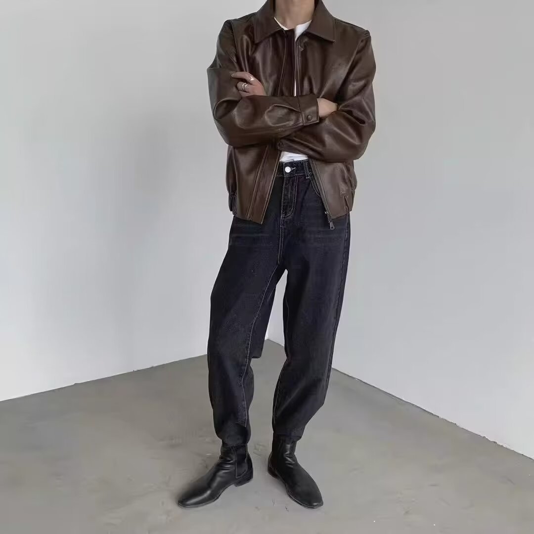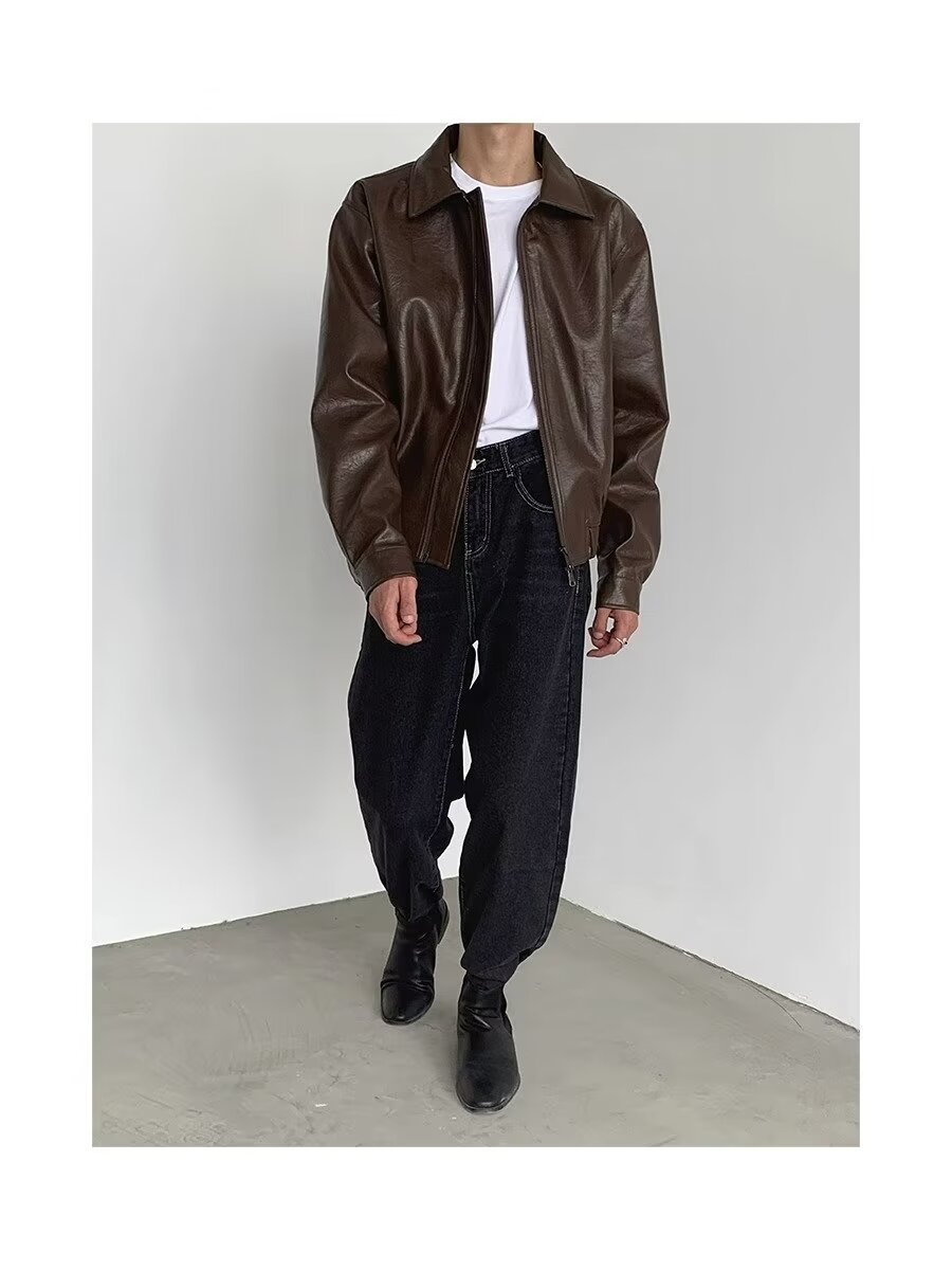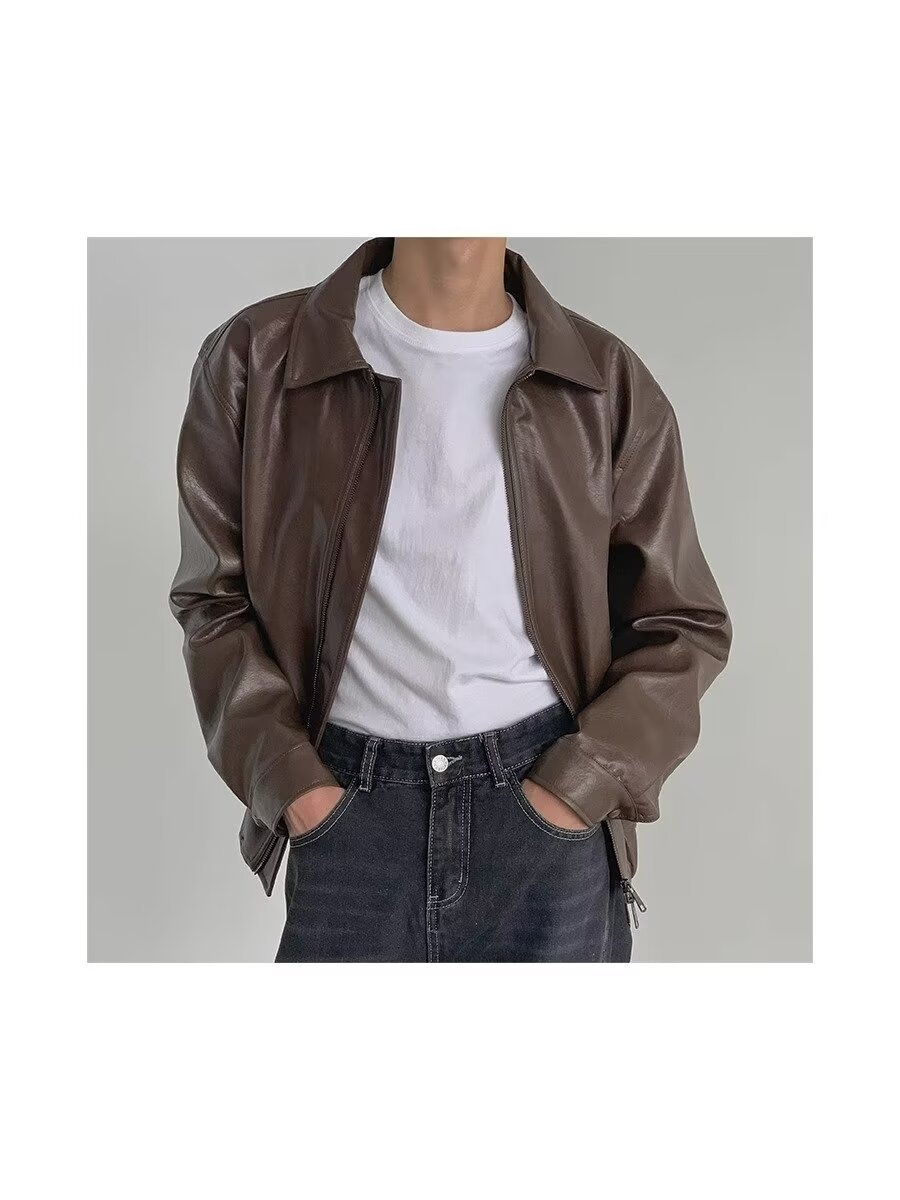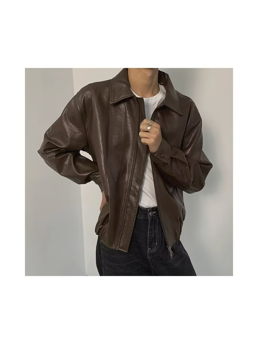 2024 봄과 가을 새로운 레트로 오토바이 PU 가죽 남성용 루즈 트렌디 스트리트 재킷 캐주얼 옷깃 재킷