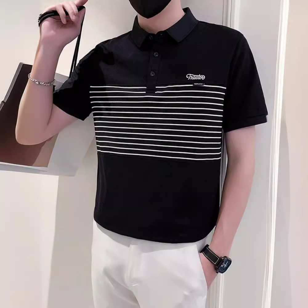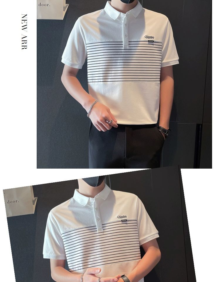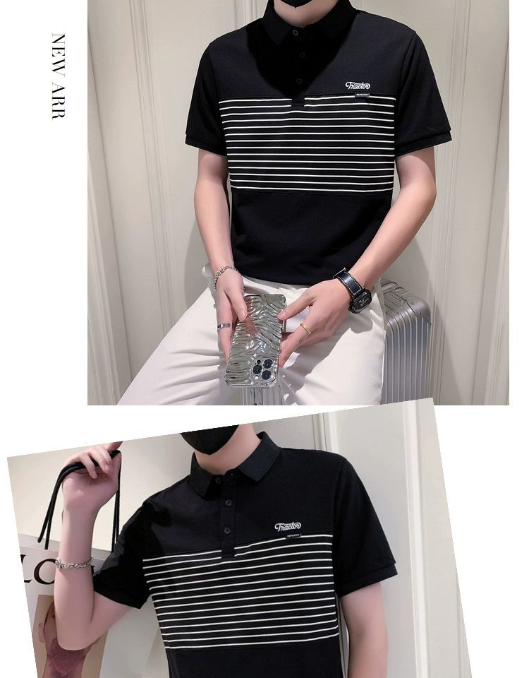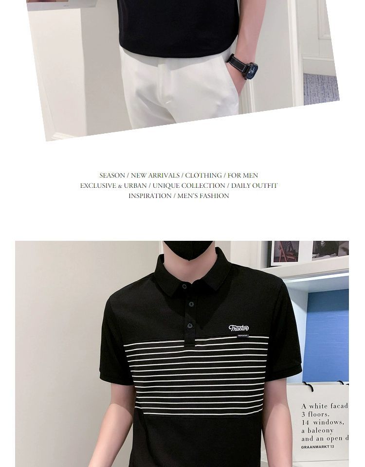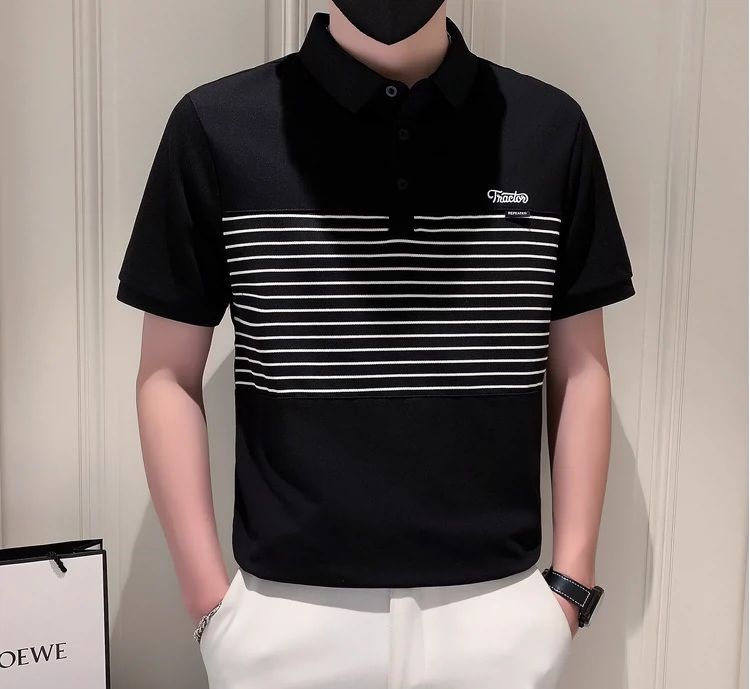 남자 반팔 폴로 셔츠 유행 브랜드 여름 새로운 도착 줄무늬 패치 워크 옷깃 티셔츠 핸섬 올 매치 반소매 여름 원피스