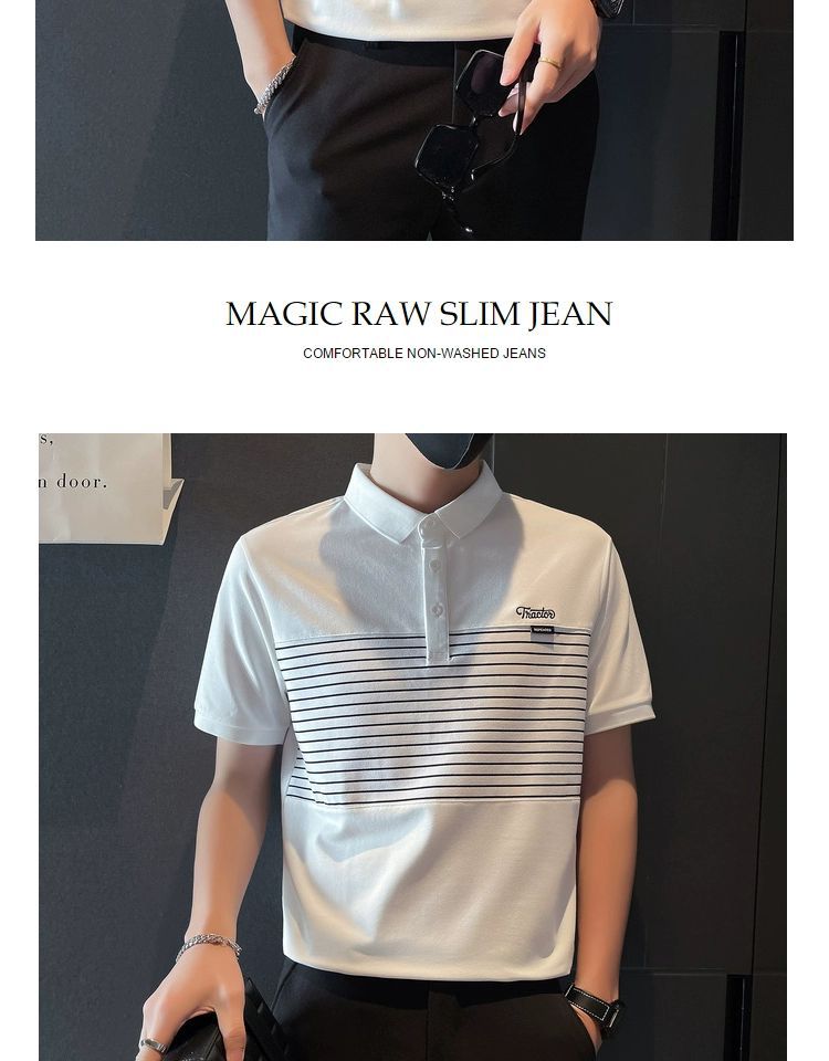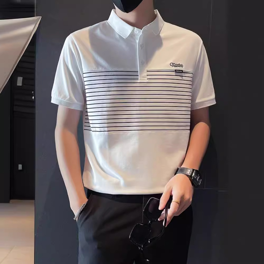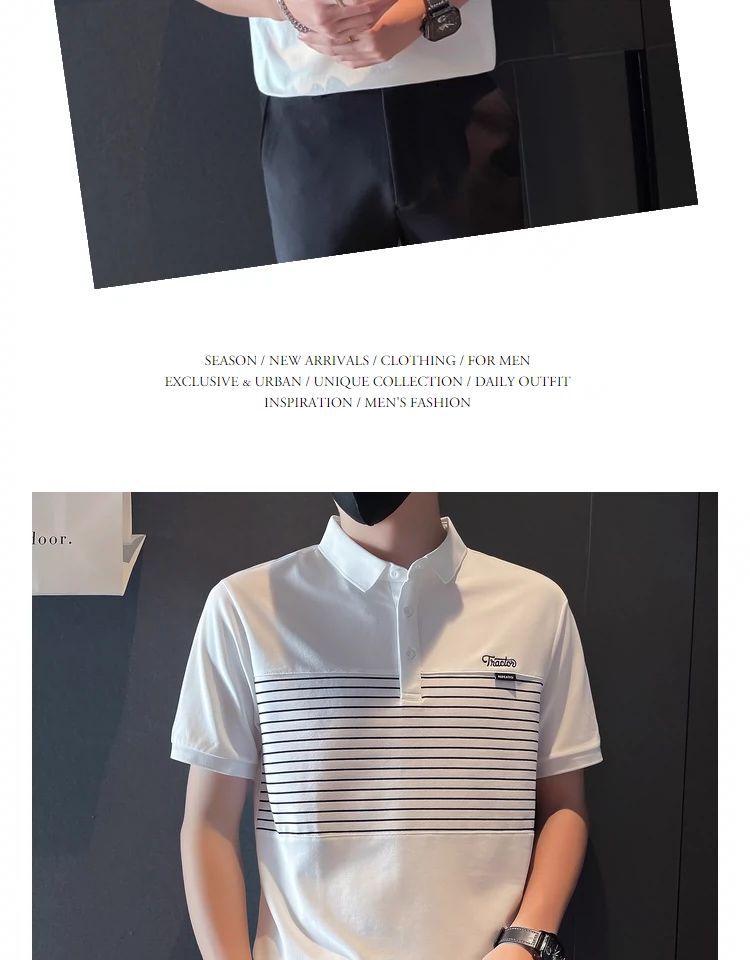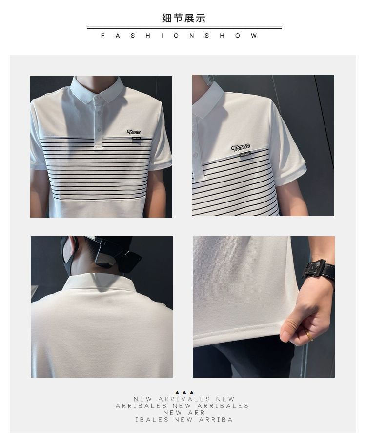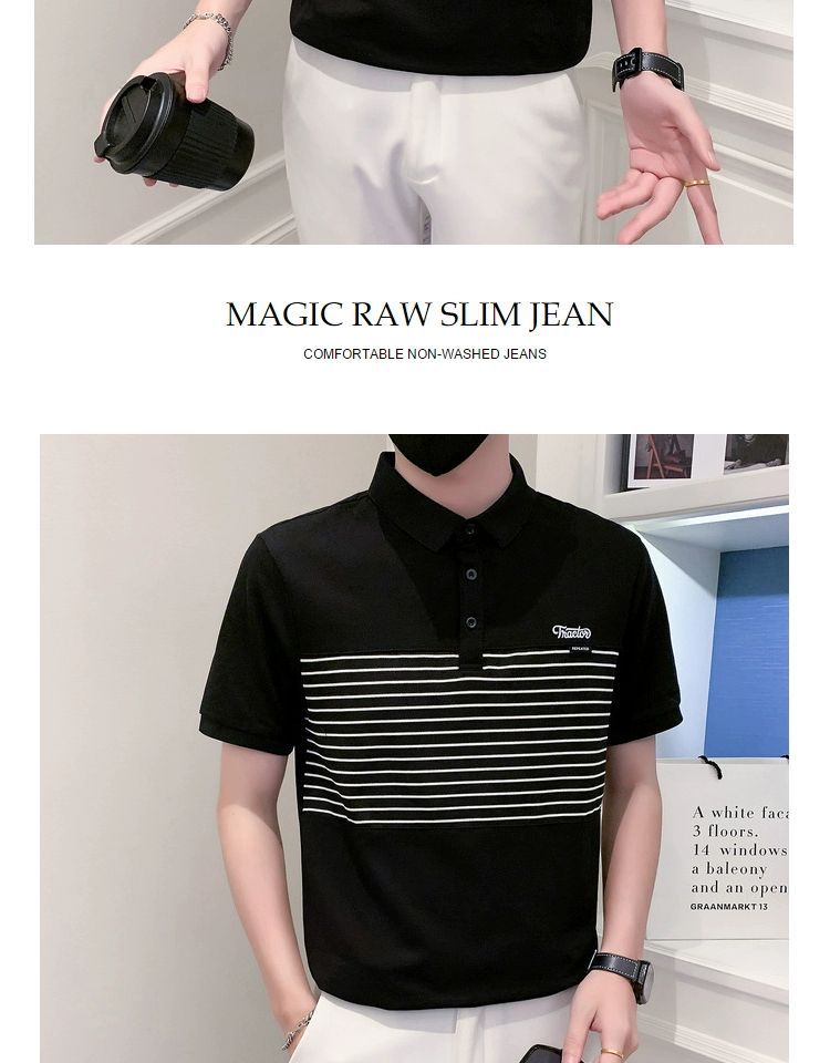 남자 반팔 폴로 셔츠 유행 브랜드 여름 새로운 도착 줄무늬 패치 워크 옷깃 티셔츠 핸섬 올 매치 반소매 여름 원피스