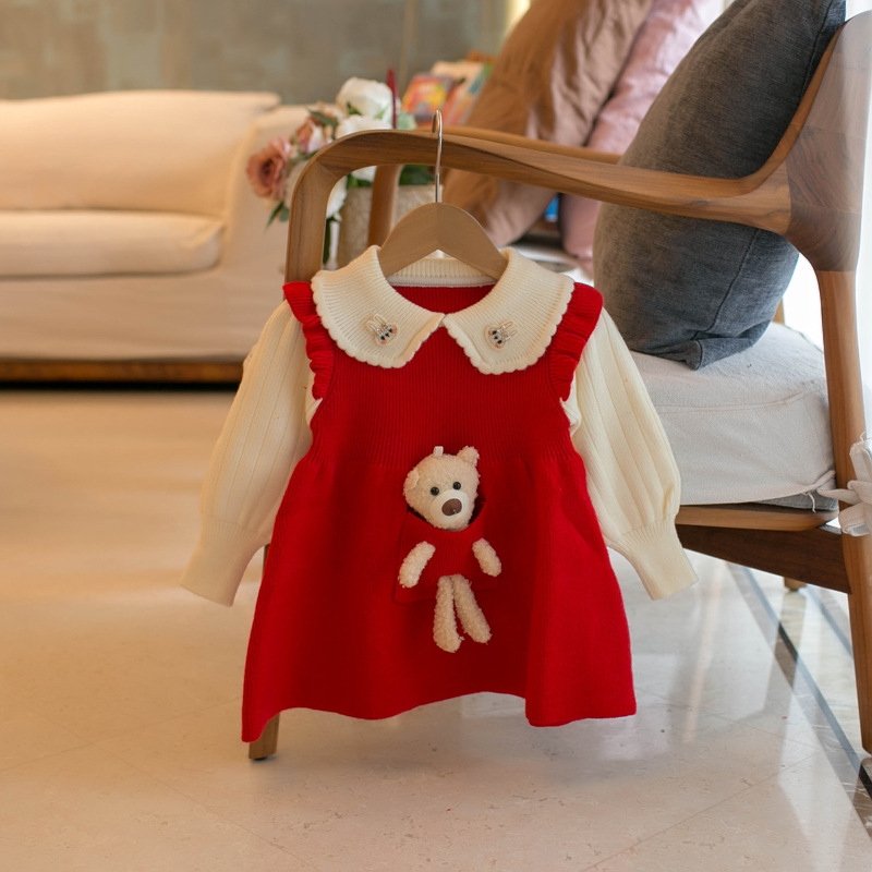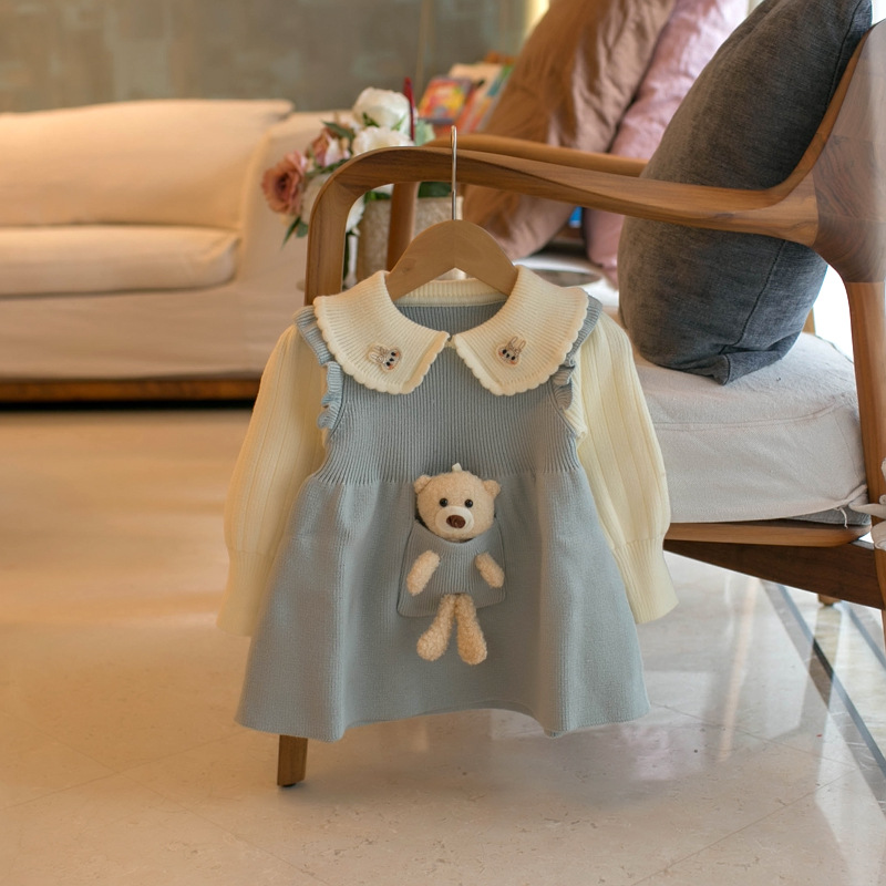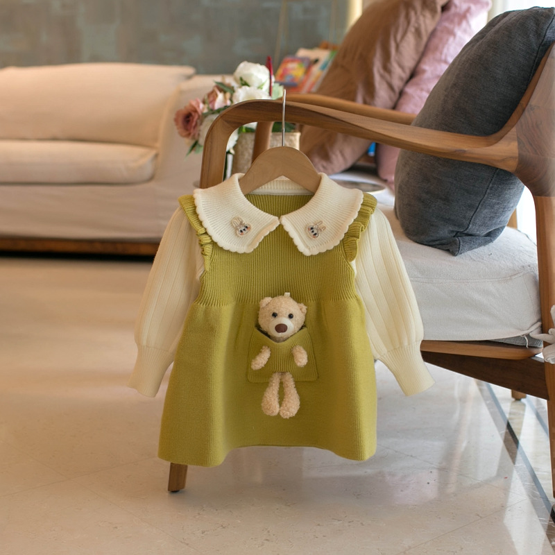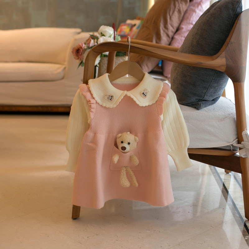 MMTKIDS 가을, 겨울 소녀 두꺼운 곰 컬러 블록 풀오버 스웨터 드레스 J901