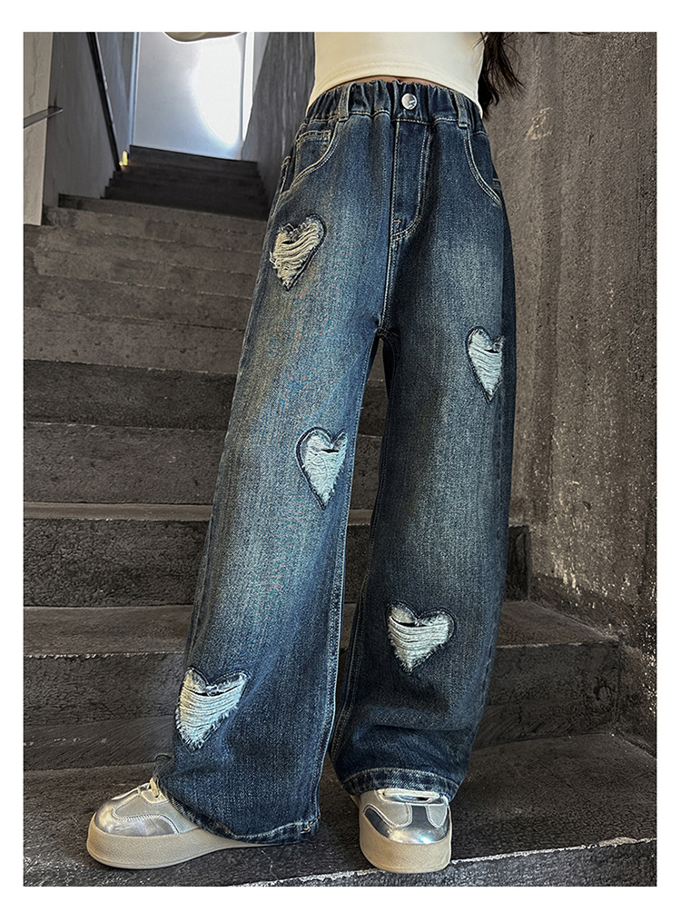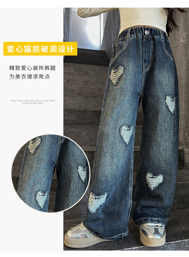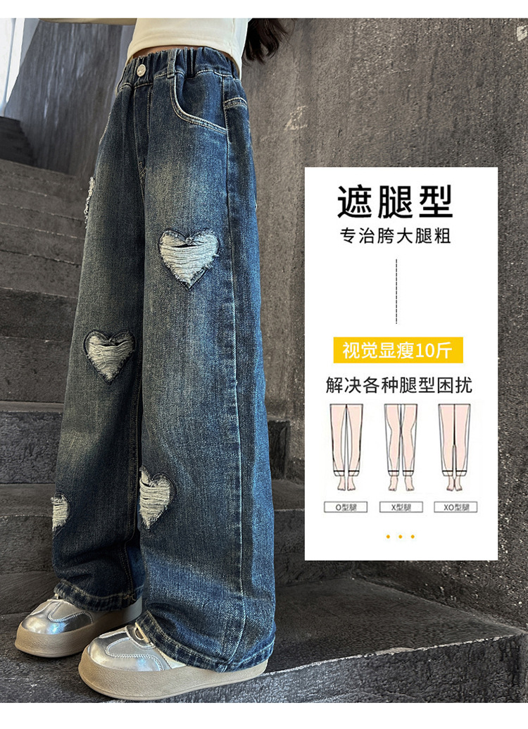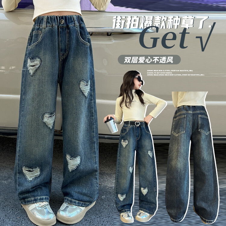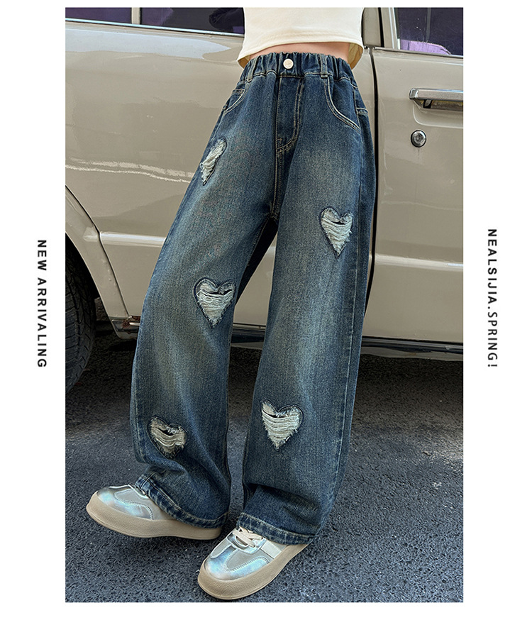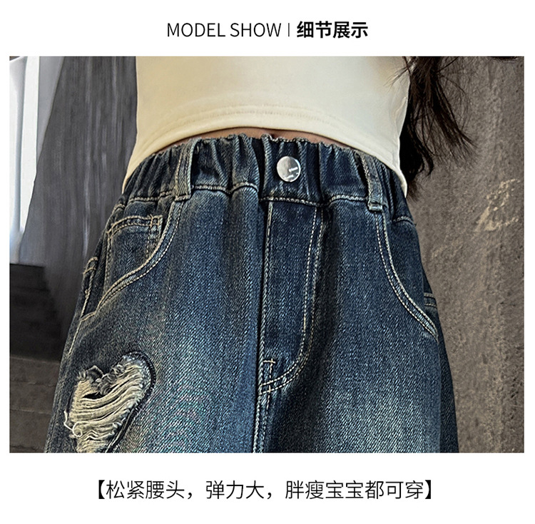 소녀의 봄과 가을 바지 2024 새로운 한국 스타일 중대형 어린이 찢어진 사랑 넓은 다리 바지 스트레이트 다리 청바지 바지스토어 가기