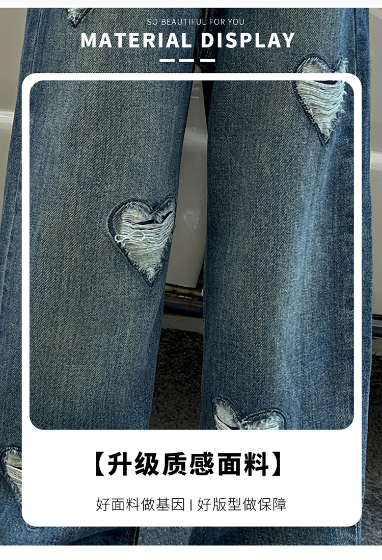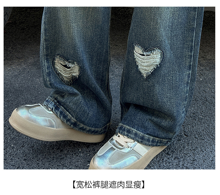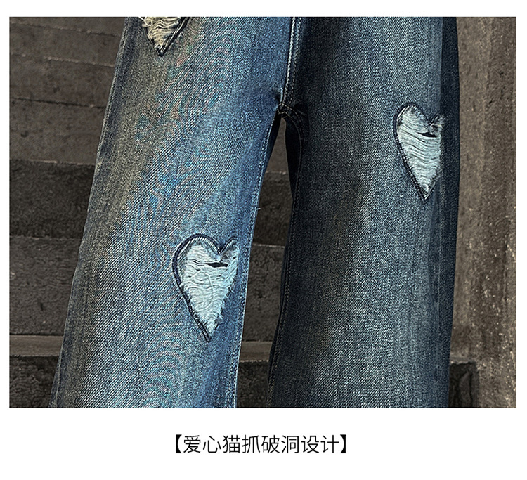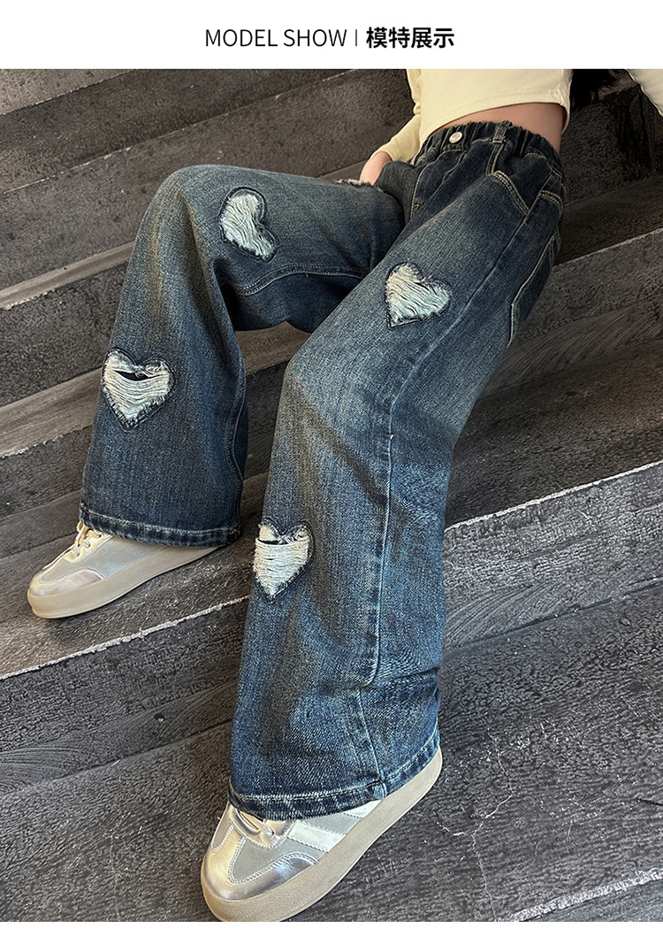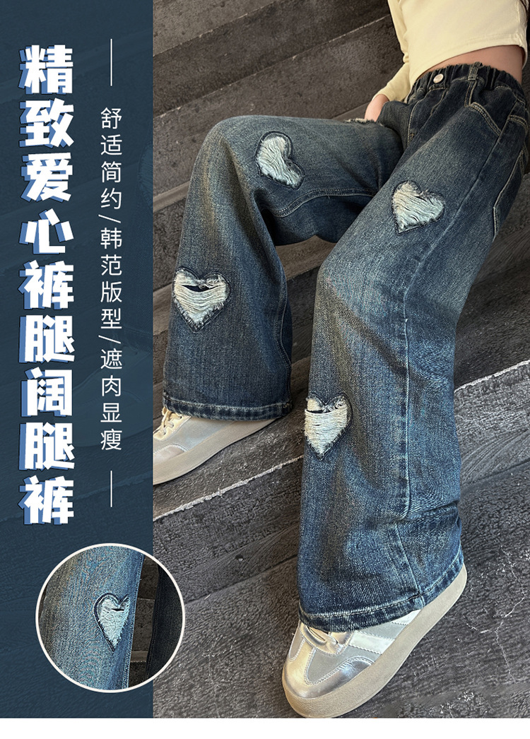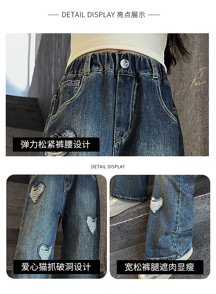 소녀의 봄과 가을 바지 2024 새로운 한국 스타일 중대형 어린이 찢어진 사랑 넓은 다리 바지 스트레이트 다리 청바지 바지스토어 가기