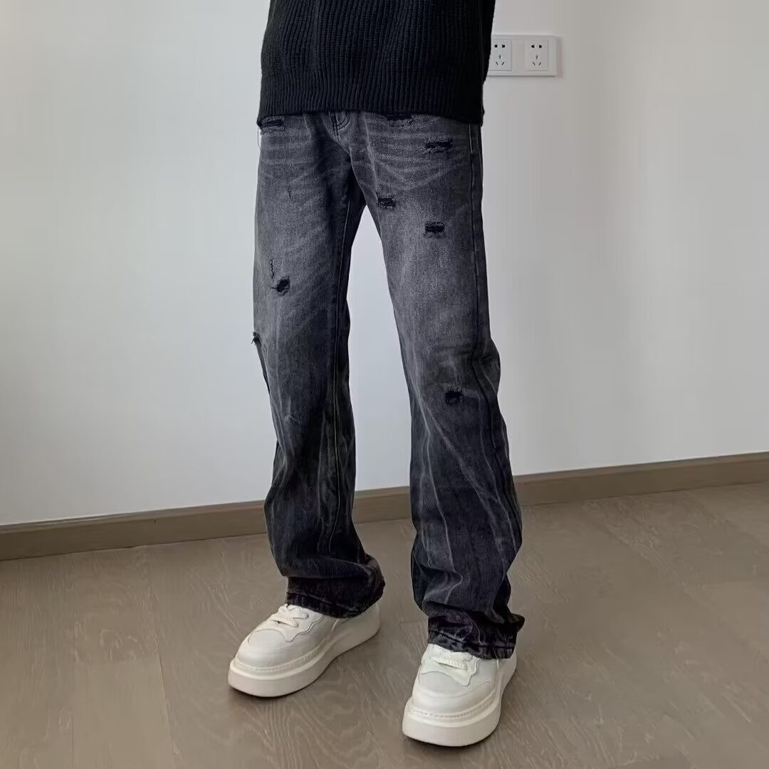 블랙 워시 드 리핑 청바지 남성 가을 패션 브랜드 아메리칸 바이브 바지 더피 핸섬 느슨한 스트레이트 바지
