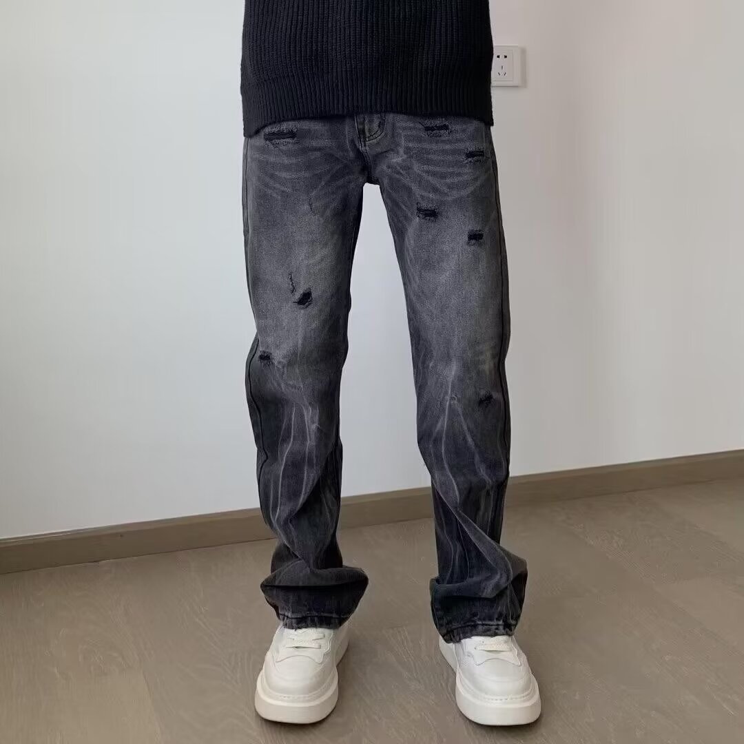 블랙 워시 드 리핑 청바지 남성 가을 패션 브랜드 아메리칸 바이브 바지 더피 핸섬 느슨한 스트레이트 바지스토어 가기
